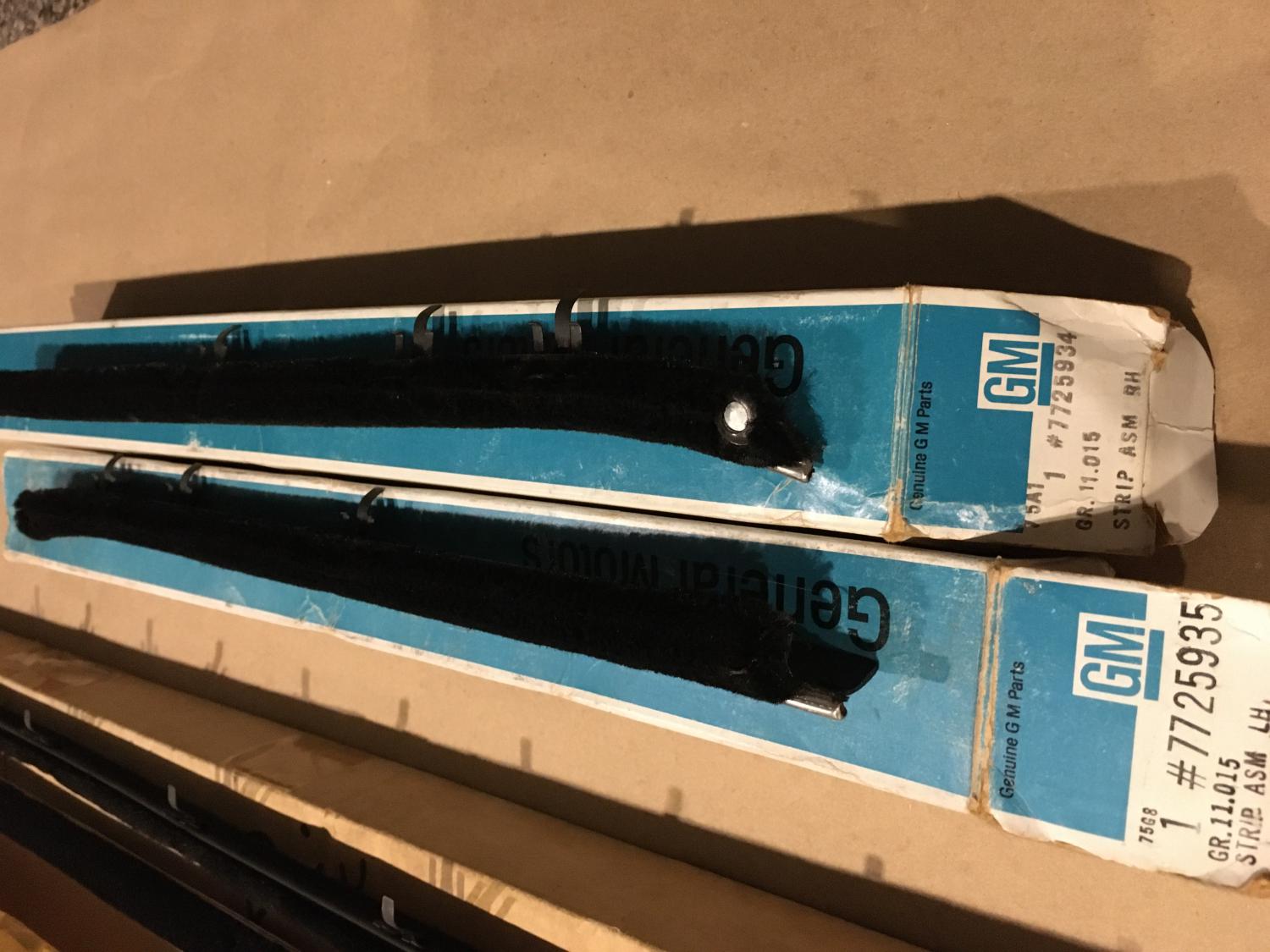 NOS Set of 6 window felts: 7725935 x 1; 7725934 x 1; 7729998 x 2; 7731200 x 2 $725 plus shipping NOS Front spoiler and 3 rods: 3938689; 393690; 3938691 $400 plus shipping NOS Regulator: D-635 1119515, Unopened Can $200 plus shipping NOS Distributor Cap: D 308R 1971244, Unopened Can $175 plus shipping Last edited by 69 L78 Survivor; 09-10-2020 at 05:15 PM. Reason: Sold Pending Payment |