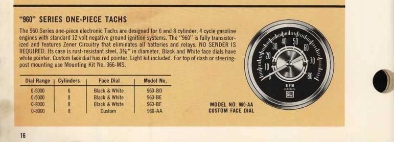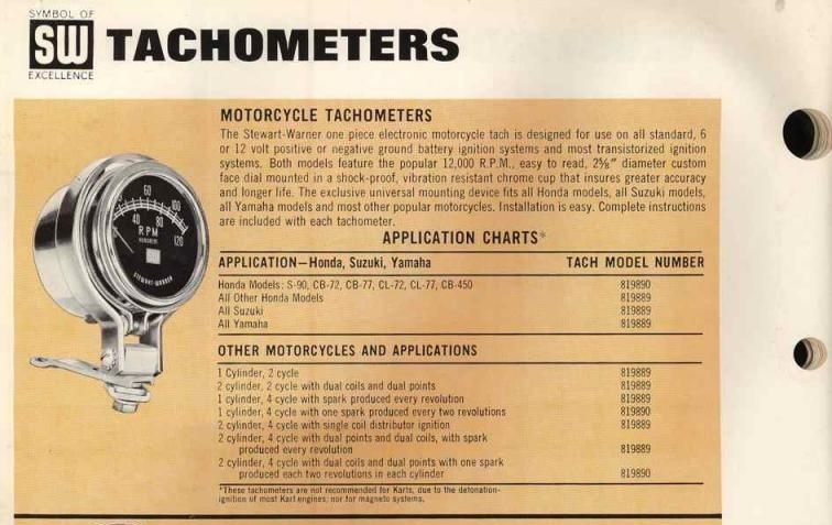 -2 5/8" Custom Face 12000 RPM Motorcycle Tach with complete SW anti vibrate stand $200 -4" 432967 Custom Face 6000 Tach (Might be NOS) comes with SW Mounting Bracket $300 See additional photos from 1968 SW catalogue. Shipping add $14, Paypal "Friends"
