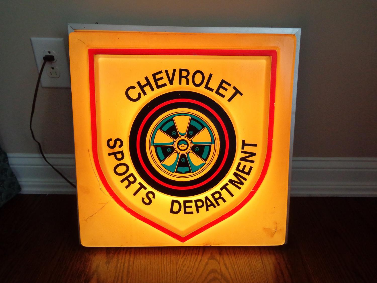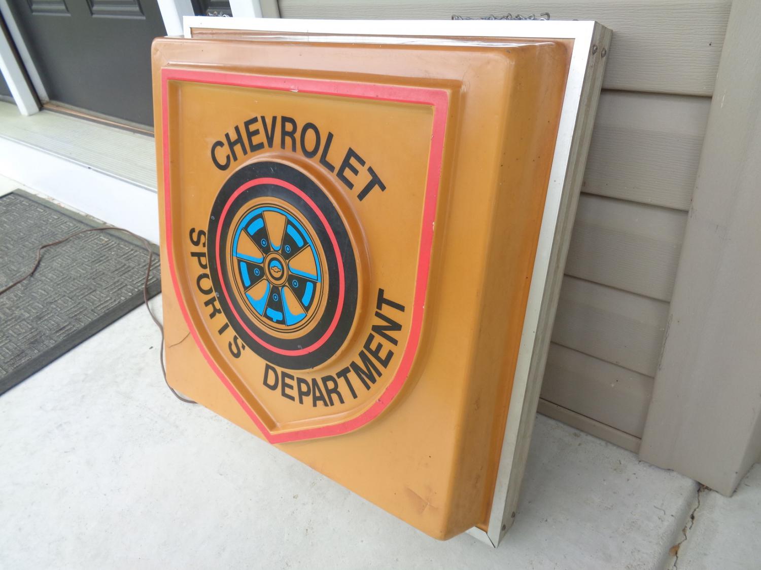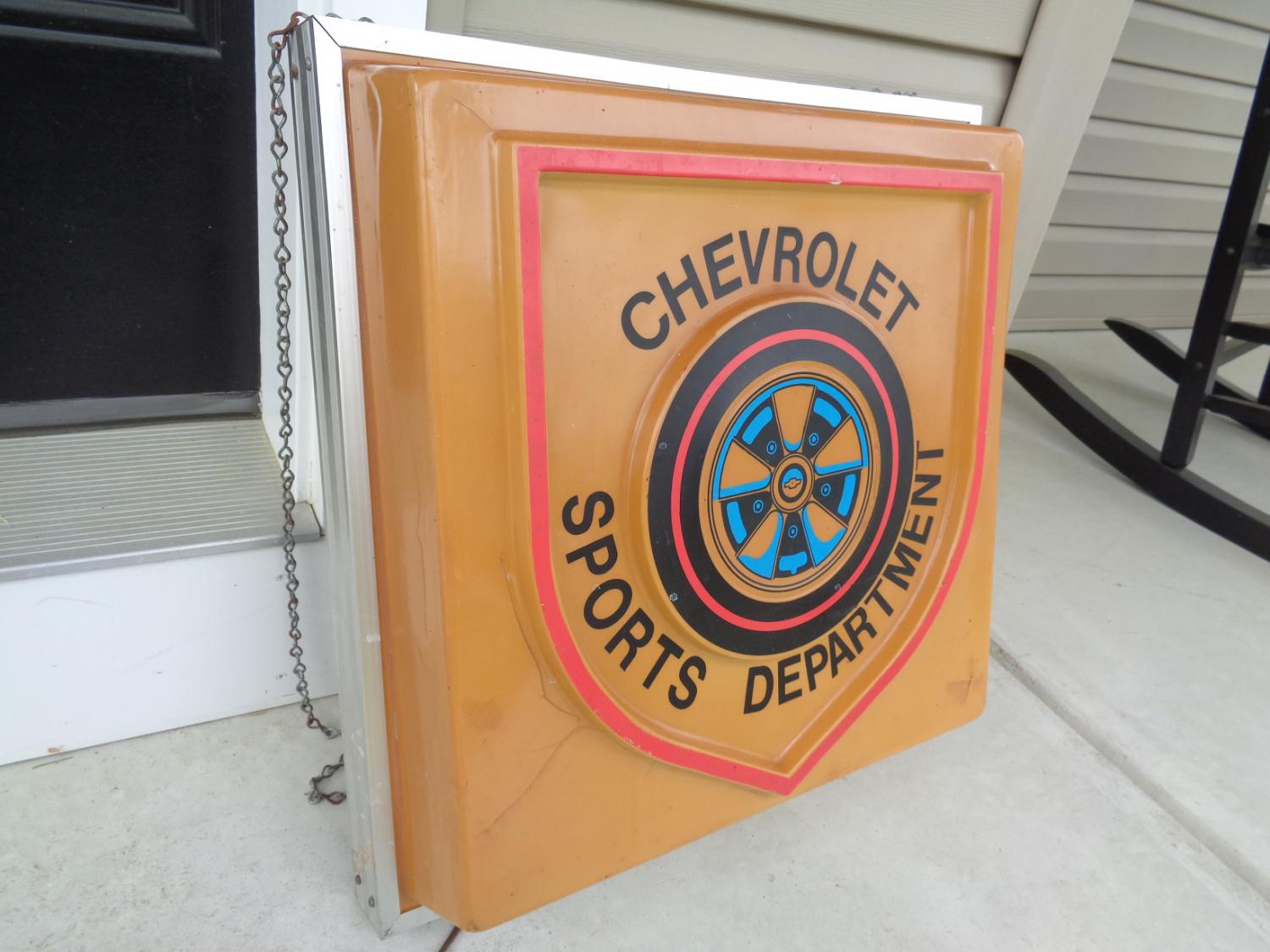 Original 1969 "Chevrolet Sports Department" light up sign. Has some cracks here and there. Works fine. Still has the hanging chain. $2500. No shipping on this one, too fragile. SOLD SOLD SOLD SOLD