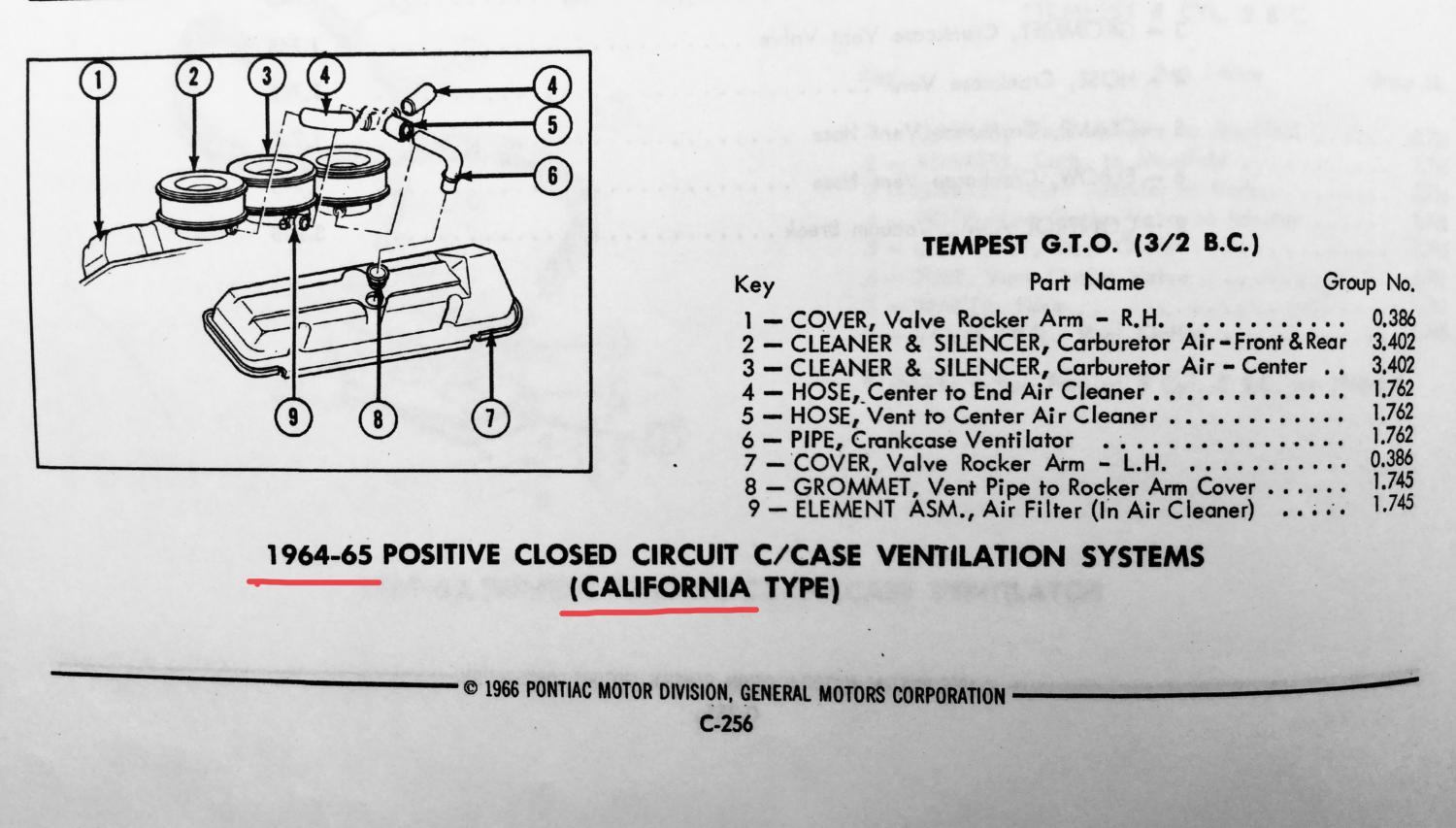 If a ‘66 GTO was sold “New” in the state of California it would now have the A.I.R (Smog with air pump) on all models EXCEPT “Automatic with Tri-Power”. 1966 Engine codes with A.I.R. code #616 shown below. WV - 4 Spd. / Tri-Power. WW - 4 Spd. / 4BBL. XE - Automatic / 4BBL. The YR code Automatic / Tri-Power did Not require A.I.R. but instead was the last model to only have the #614 if sold New in California. The ‘66 YR #614 utilized a molded rubber hose from the center carburetor over to a nipple on the chrome twist “sealed” oil fill cap. The opposite RH valve cover was now solid (no holes or plugs). The 1966 GTO with engine code YR had a build of 1759 total. There is no record showing the total of the California YR with the #614 option, but it should be substantially less. The ‘66 Car Billing History Card, as well as the Window Sticker shows #614 for this sold New in California YR GTO. Chart showing Engine/Transmission with codes and total builds for 1966. Last edited by 60sStuff; 05-28-2021 at 09:41 PM. |
