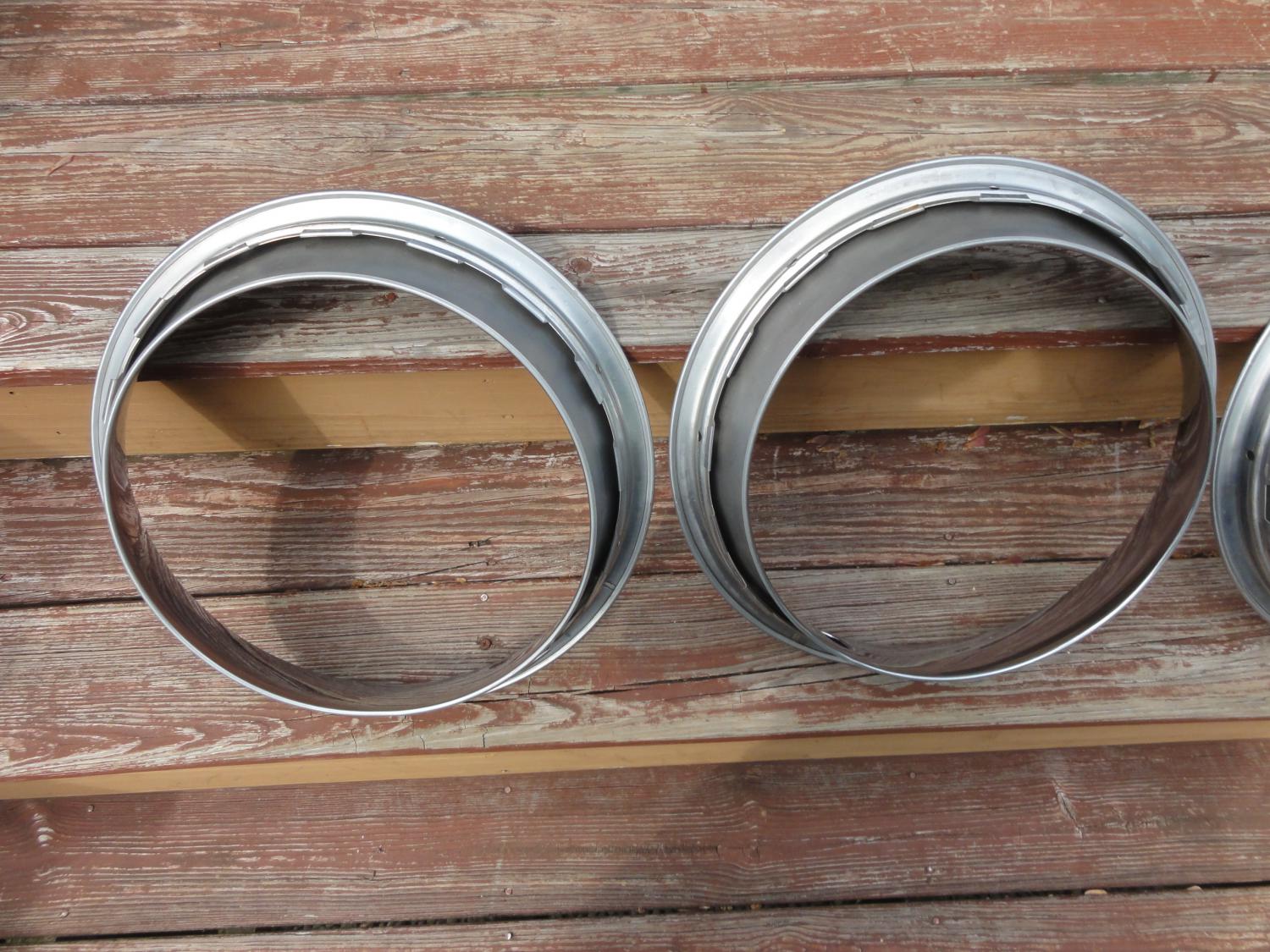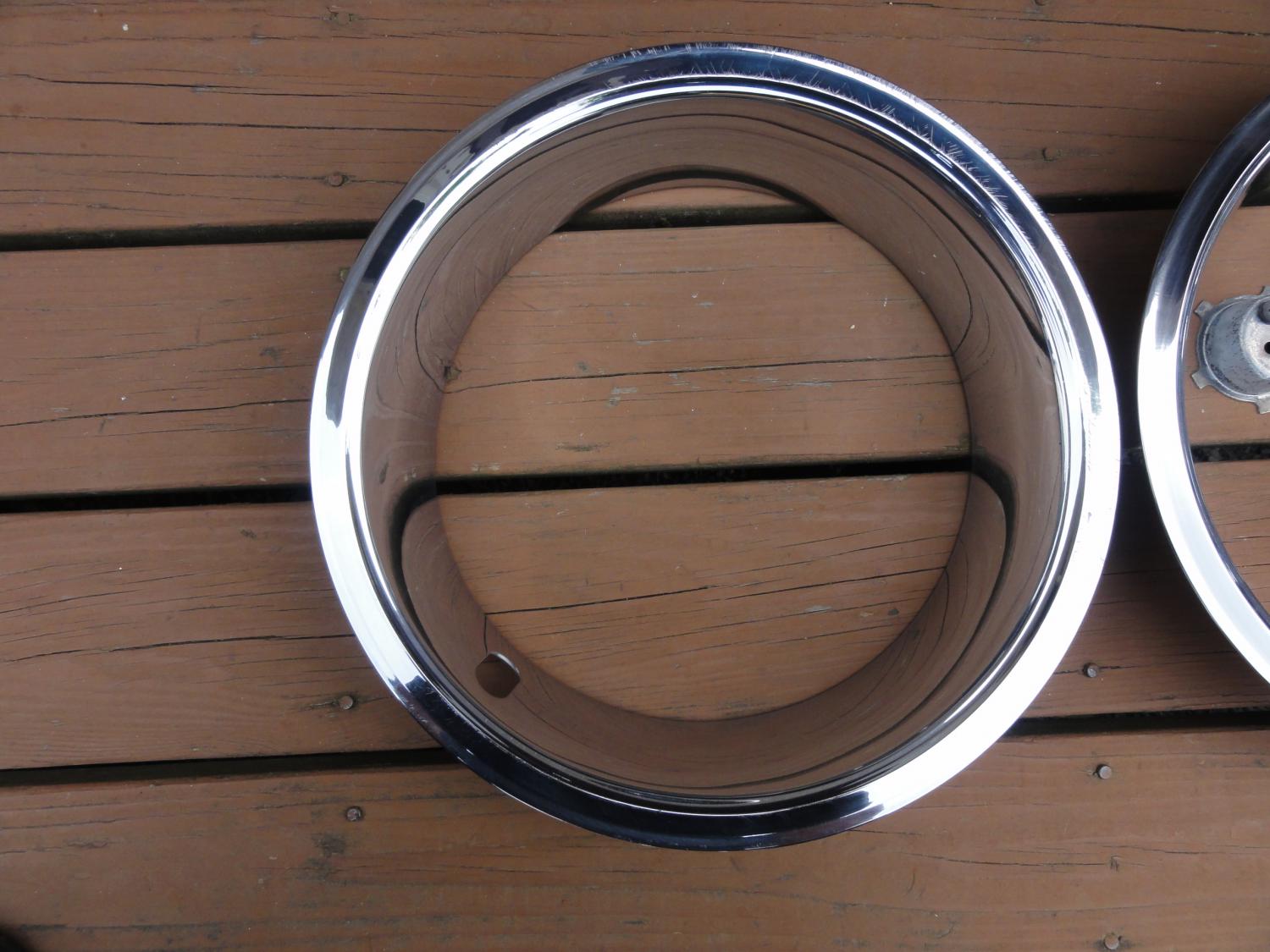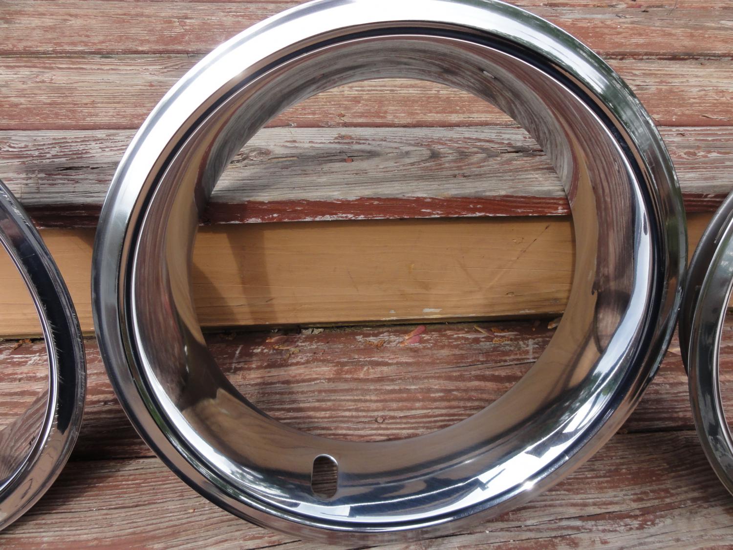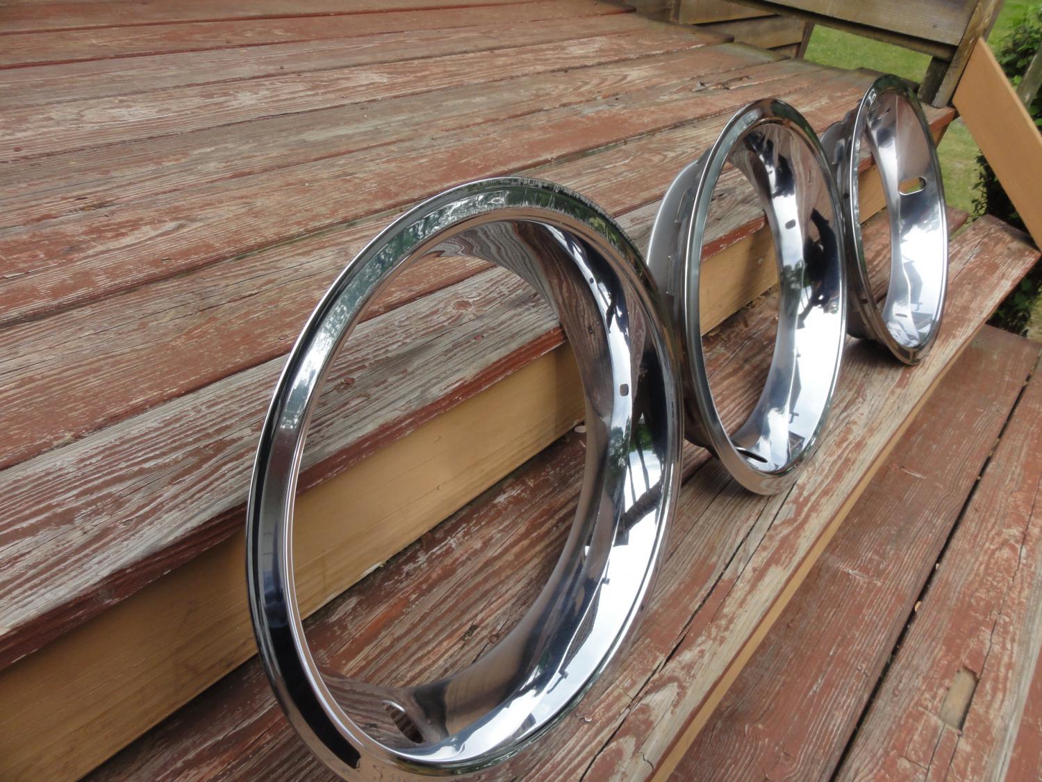 3 original trim rings driver condition , 2 are very decent have usual scratches very small rash on one, etc,. 1 has curb rash.Center caps are nice survivor condition. Push on one has all prongs in tac, minute specs in chrome more noticeable in pics. Screw on cap is excellent survivor condition, has original screws & retainer thread holes are good.( 3 trim rings 75.00)( Push on cap 50.00) (Screw on cap 65.00) Plus shipping on all items . Look at pictures for condition of all items. I posted a lot of them.