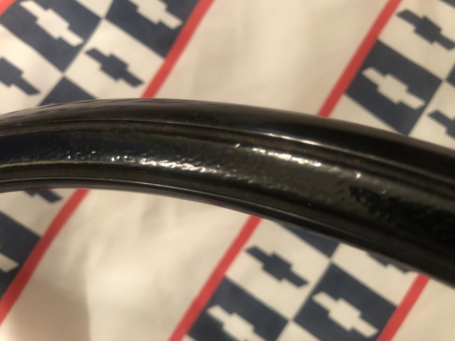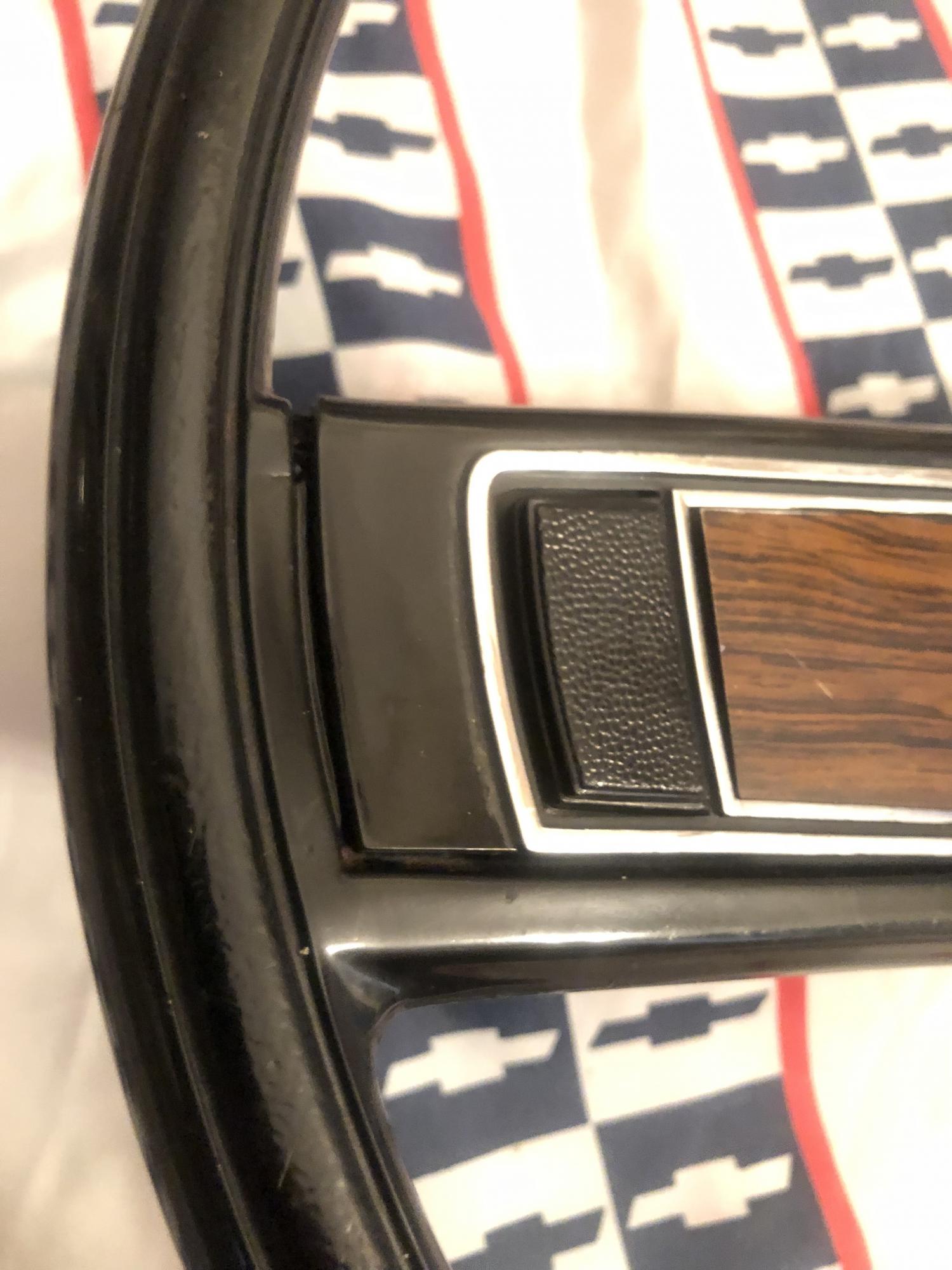 Original 69 black standard steering wheel with deluxe woodgrain horn shroud. No cracks on the rim, a couple tiny splits on the back corners of the crossbar, and a larger split on a new side of the hub area as shown. Some other minor scratches from being over 50 years old, but when in installed it would be very difficult to see any imperfections at all. Shroud looks to be perfect, with original horn buttons, contacts, and wiring intact and uncut.