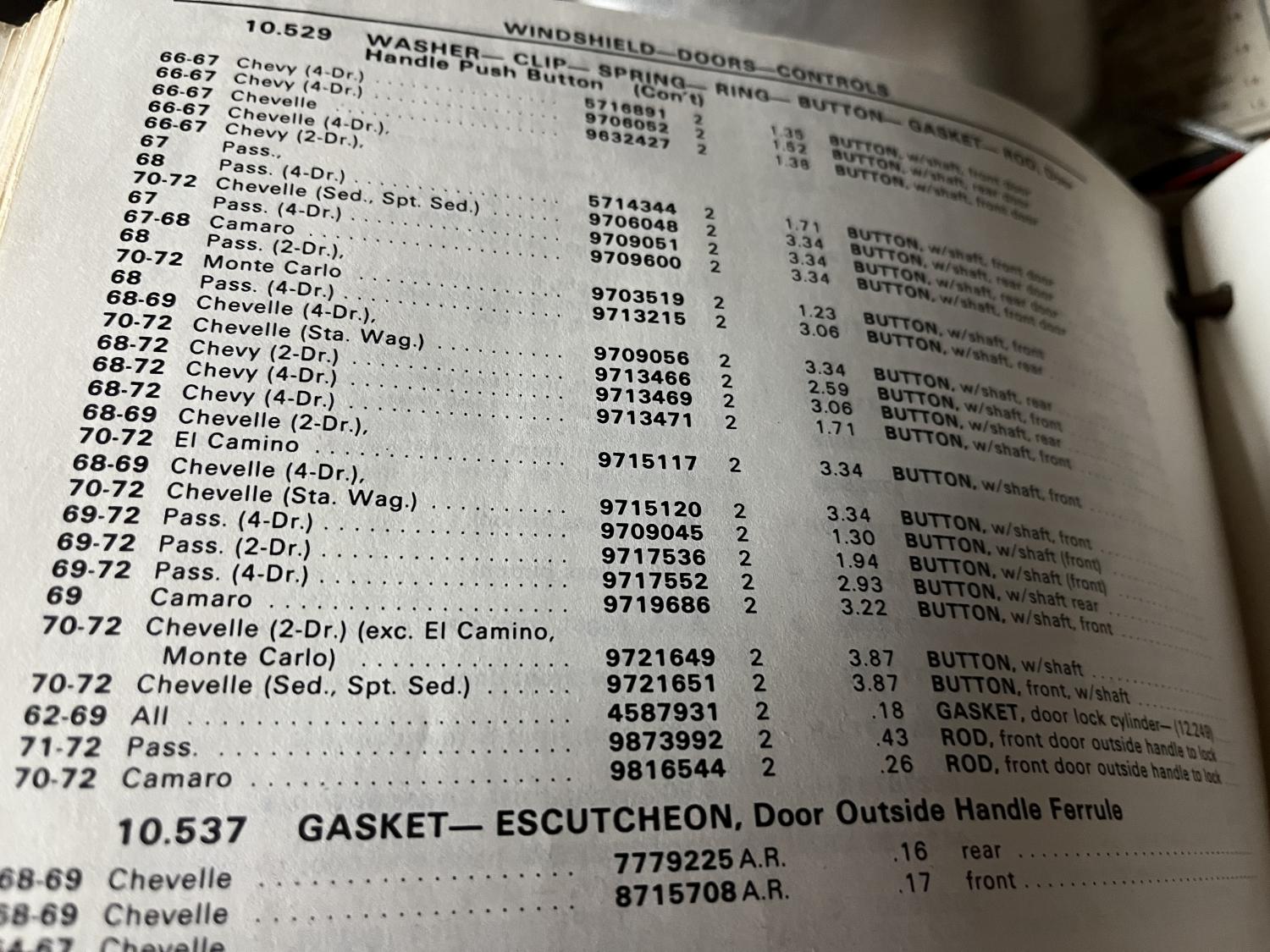 I have a pair of NOS outside door handle buttons still factory sealed in the old GM wrapper as shown. button with shaft Part number 9632427 - as pictured 63 - 66 Corvette "2nd design" & 1967 Corvette 66 & 67 Chevelle $60 PPFF for the pair shipped. Cheers, Anthony |