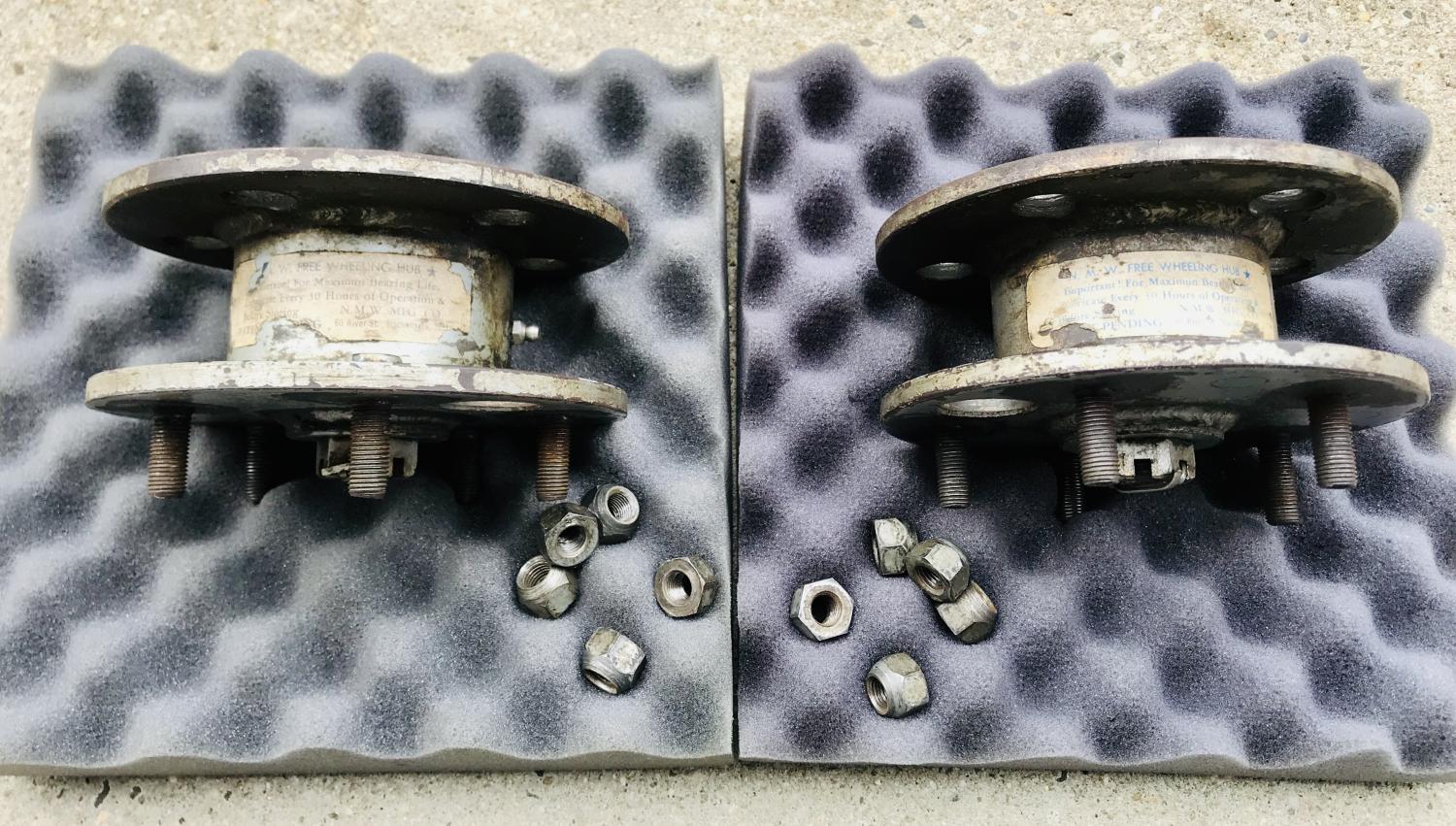 Nice early pair of NMW free wheeling tow hubs. The bolt pattern is 4-3/4 GM. They spin very smooth and can be used as-is. They are still wearing the original silver paint with both NMW labels present. (SOLD)