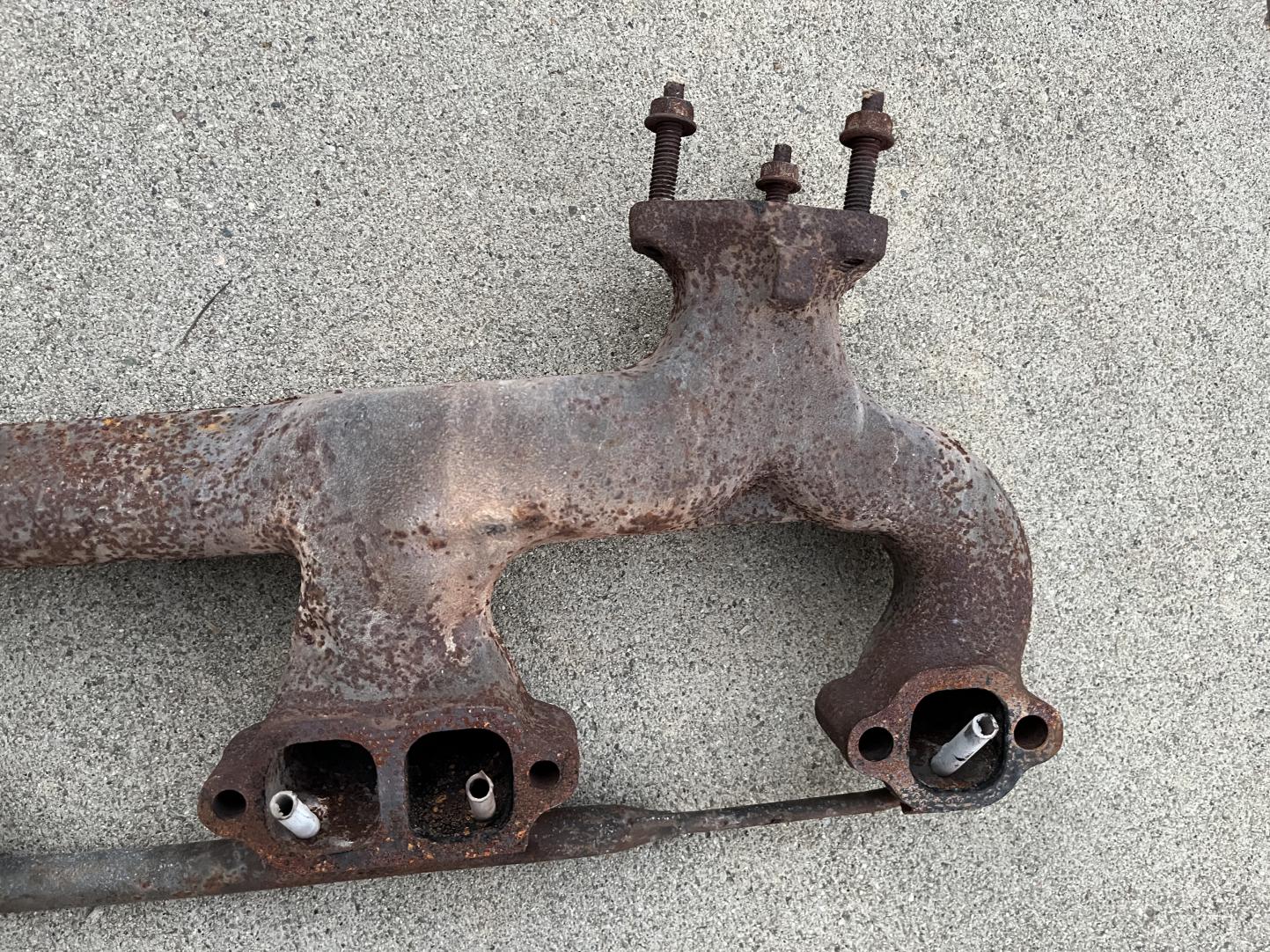 7801149 cast 137, stamped 148 squared off 72 only black fan (one nub broken off) smog pump spins freely and make the required noises to indicate that it may still pump as intended but no guarantee of course; consider it a rebuildable core. set up (as pictured below) includes these all original factory parts: 2X exhaust manifolds one numbered 3989041 dated D27 2 other side unknown 2X smog tubes 2X check valves 2X smog hoses 6271048 & 3939476 - original GM 4X tower clamps 4X beat up spark plug heat shields lower alternator bracket smog pump bracket with square retaining nut and bolt and 29295 diverter valve 3942533 extension set up will need clean up at best for a driver or resto; these piece have been sitting for years, no warrantee on anything of course. Cores. $350 plus shipping - this will be heavy and large, be prepared. Thanks all, Anthony  |