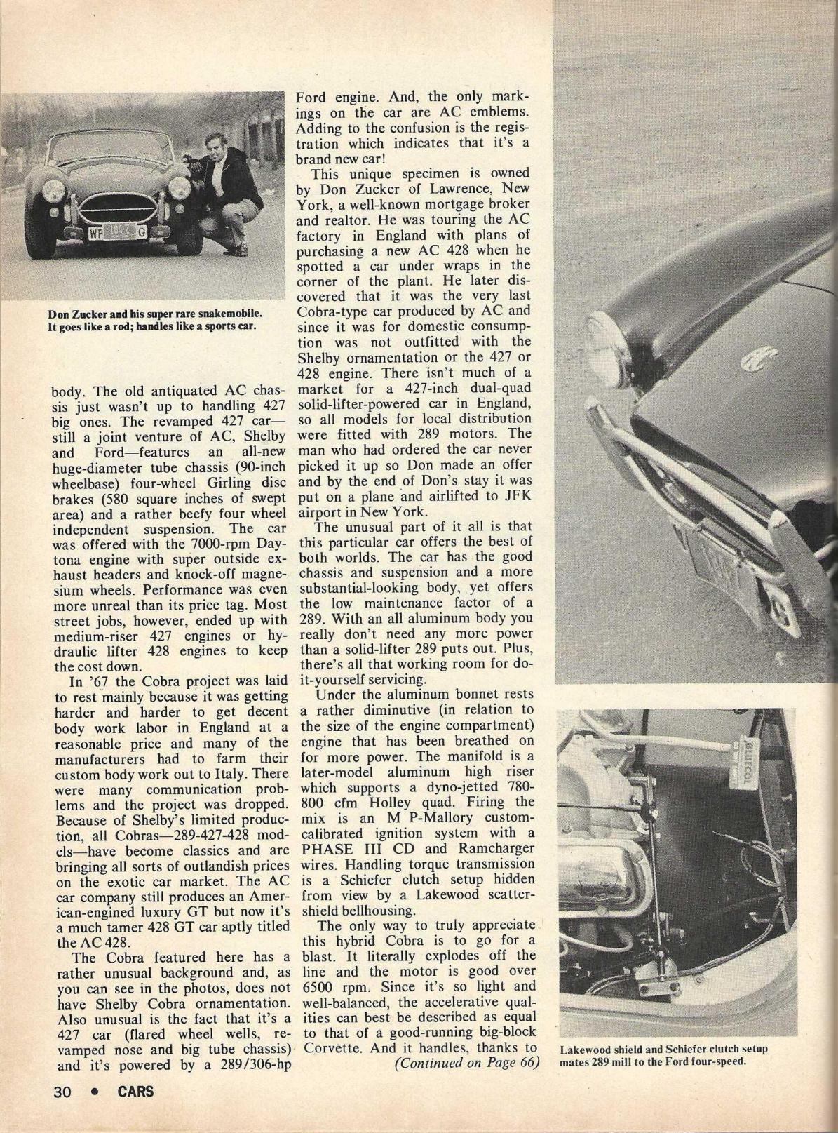 The car in the article is COX6123, was blue/black leather and in 1997 was thought to still be in the hands of original owner Mr. Zucker. Perhaps someone with a new registry can chime in with its current caretaker. These were referred to in the book as “Mark III/289” cars and AC gave them a 61xx numbering system and they’re all COB or COX prefixes. They’re numbered COB6101 to COB6127 (with some COX’s in there, as stated, usually LHD). There’s also some chassis numbered 6128 to 6132 that were sold to Paramount Film Service for use in movie work. All were sold later and most became the basis for Cobra replicas of some sort.