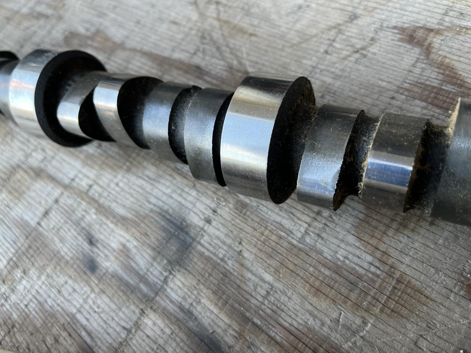 Has factory applied pink paint on it and some cosmoline still present - any crumbs are remnants of cardboard from the chaffing of decades in that tube. Mechanical / solid lifter cam of course.