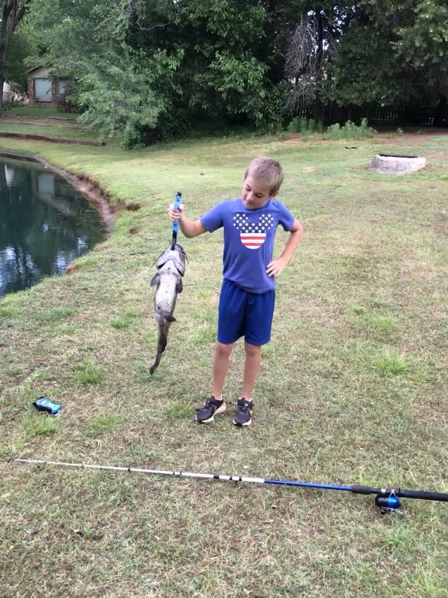 They finished the baseball regular season with only one loss for the year... and that was a one run game. Start a post season tournament next week. They both pitch. When not pitching, they still play short and second. So fun watching these little guys. 10 years old, and just finished fourth grade. Up to 62 pounds and hitting a baseball 175 feet. Now they are really into fishing. I don’t fish, but my son (their Dad) does, and he taught them well. They have their own tackle boxes and set up everything. I hve been fishing with them three times so far, and the only help I have given is getting a stuck line out of the water. There are two ponds in my son’s neighborhood. Lots of tiny blue gill and big catfish. They start out catching the little blue gill on fake worms, then use the blue gill for catfish bait with a circle hook. They did great today. Both caught several in excess of 5 pounds. Here is Cade with the last catch of the day. I don't know how to upload a short video. The catfish got some revenge right before I took this still shot.