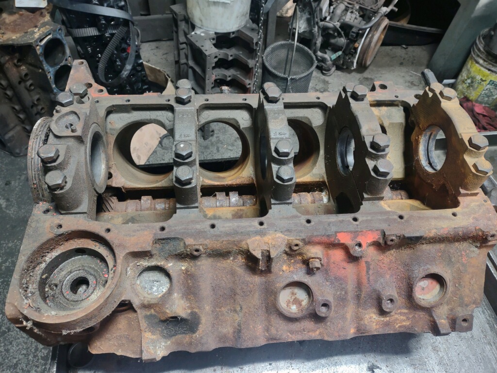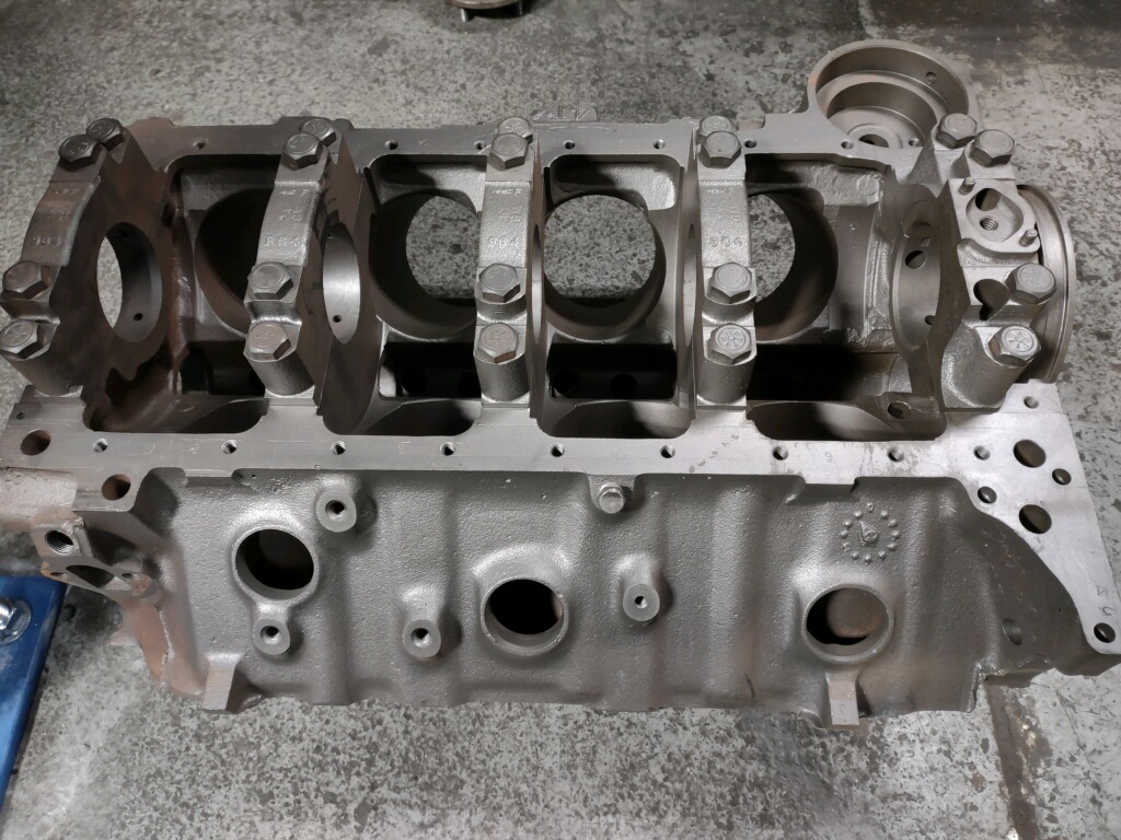 The block measures at standard bore, has been cleaned and magged. The first photo is how it was found with the original cam in it.