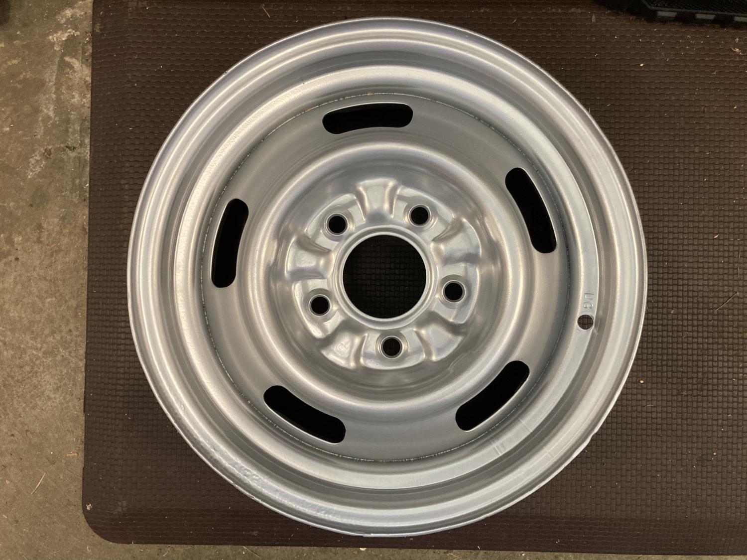 I ended up with an extra DG wheel after we put a set of 5 together. This one is a pretty good wheel, but suffered a bit of pitting (looks like it was on a car with a flat tire for a while). Previous owner stripped and powder coated it, said it sealed up fine prior to refinishing. I’d probably do a little filing and sanding and shoot it with black and argent. Asking $120, which is less than half the going rate for good DG’s. Buyer pays actual shipping (FedEx Ground or UPS, your call) I already have a good 15x15x7” box ready. Thanks!