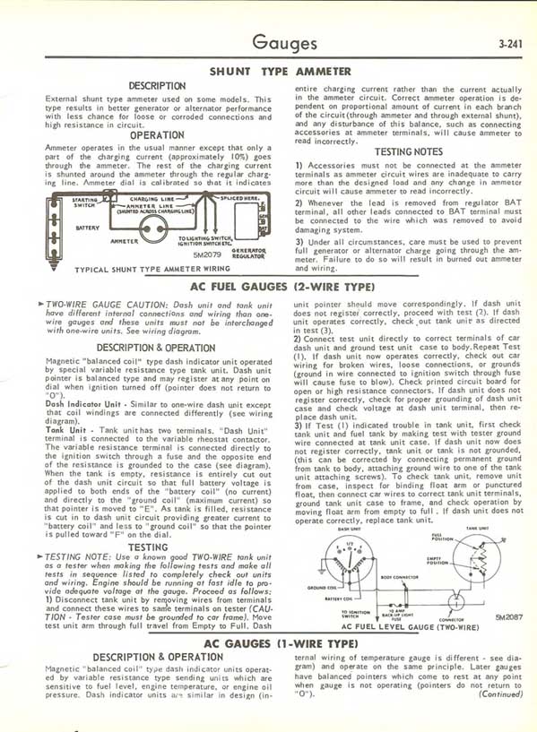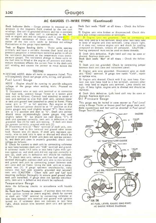 0 ohms Empty 90 ohms Full An Open or infinite resistance will drive the gage to the right way past full indication. Servicing sheet attached. I built a "Gage sender" simulator that can be temporary installed in place of the Gas tank sender to the Car wiring and drive the Gage while sitting in the drivers seat. The Same can be accomplished by using a Resistance Decade box, but this tool is plug and play. JIM