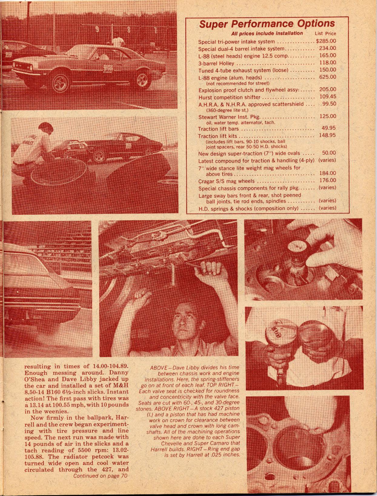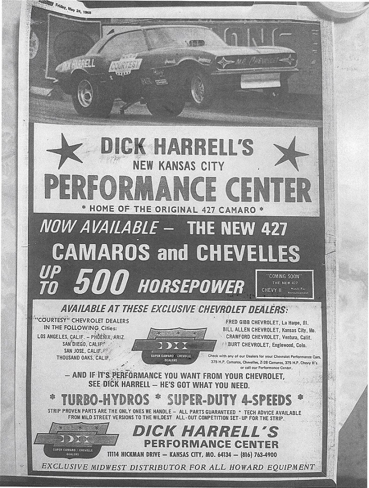 Dick Harrell's ad appearing in the 1968 May 24 issue of "Drag World" relevant to the 68 427 Chevelle's.