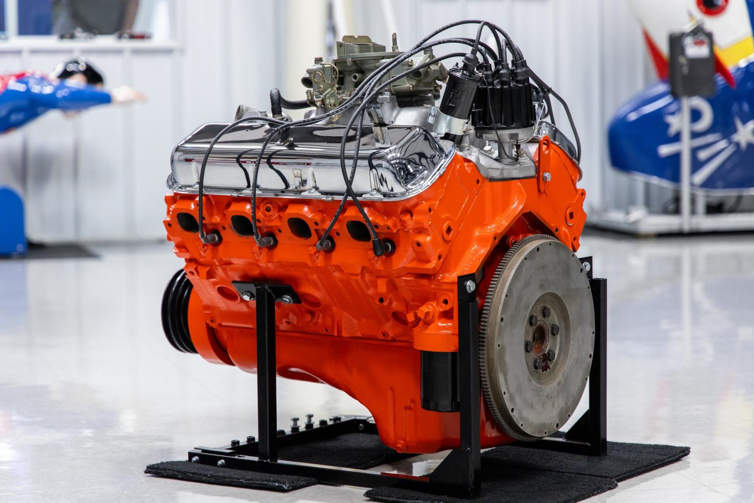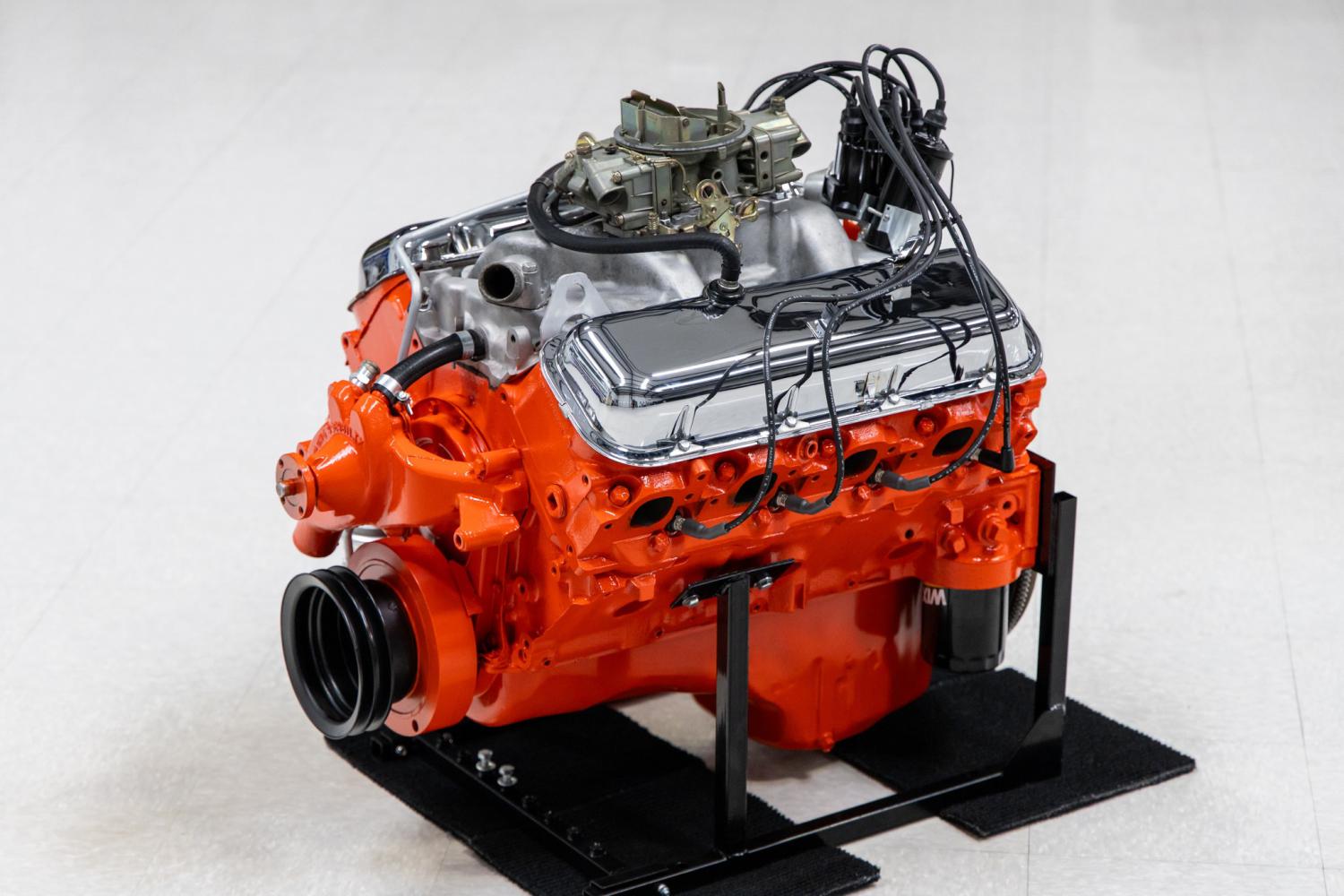 This engine started as a factory 427/425hp V8 with casting number #3963512. The casting build date is E-7-69 which is May 7th, 1969. The block was re-stamped T0509MN on the engine pad which is Tonawanda, May 9th, 427/425hp 4-speed. The block was completely prepped and bored .060 over. The 4-bolt main was line honed. The 6223 steel crank shaft was turned .010-.010 and Clevite bearings were added. It has a new GM solid lifter Camshaft with 425hp spec .022-.24. The GM 427 dimple rods were rebuilt with new 7/16 full floating bolts. It has new 11-1 closed chamber forged pistons with Moly file fit rings. It has a new stock pressure oil pump and double roller timing chain. It has a correct timing cover and 8” balancer. The water pump has casting number #811. The heads with casting #3919840 were reconditioned including new springs. The casting build date is D-69 which is April of 1969. It has an original GM restored square port intake with casting #3933163. The 1969 style chrome valve covers were replated for a factory correct appearance. The oil pan is a correct for a 1969 Camaro. The engine was completely balanced.