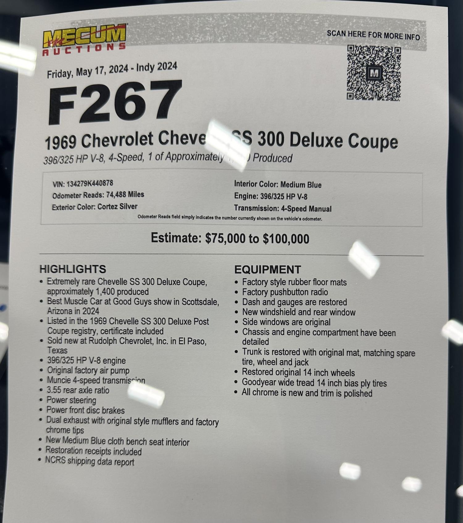I was at Mecum Indy today. This is such a good looking Chevelle. I hope it does well.