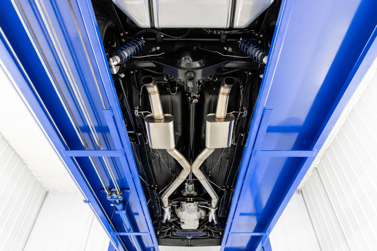 The engine compartment is highly detailed throughout with all new parts. The backside of the hood was painted body color and covered with insulation. The hood pivots on Ring Brothers black aluminum hood hinges. The firewall and inner fenders were also painted body color. It was setup with an Anvil carbon fiber closeout panel and fender braces. It has a new American Autowire wiring harness and Detroit Speed wiper motor. The car is powered by a new GM Performance LS3 V8 with upgraded ASA camshaft rated with 525HP. The engine was setup with a Haltech fuel management system including Radium Engineering fuel rails. The engine was dressed with a Holley retrofit oil pan, Holley complete accessory drive system, Roto-Fab air intake system with K&N air filter and billet valve cover cap. The engine is cooled by a Griffin Performance aluminum radiator with Gold Case shroud and SPAL electric fan. The engine breathes through Hooker ceramic headers and a dual exhaust system with Summit Racing 304 stainless oval mufflers that exit directly below the rear end. The engine is coupled to a new Tremec TKX 5-speed manual transmission with GM Performance LS7 clutch. The power is transferred to the pavement with a CT driveshaft and Ridetech Quick Performance 9” Rear end with 3.70 gears. The power steering system consists of a Borgeson Performance steering box and Holley power steering pump.