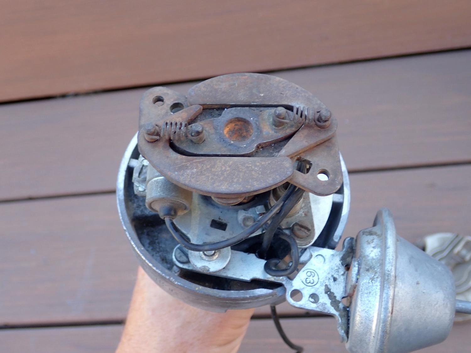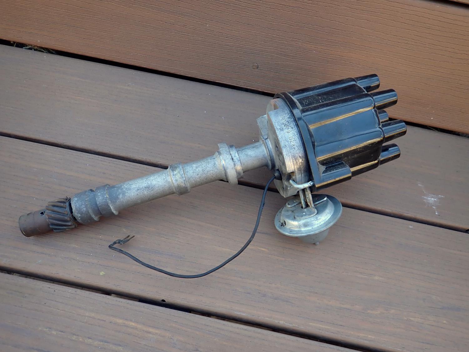 This distributor is in good unrestored condition as shown. I see no breaks or repairs to this unit. The stampings are intact and easy to make out as shown. There is some oxidation right on the part numbers and pitting on the very bottom of the housing in the same area. I used some vinegar and #0000 steel wool to lightly clean some of the staining off the stamp. It will probably clean up more but I did not to clean it too much. The advance cam is stamped 732 CCW. The vacuum advance appears to be a replacement. This distributor turns smoothly with no binding or sloppiness. The wire that hooks up to the coil is intact with the factory crows foot connector as shown. This is a very nice factory high performance distributor.