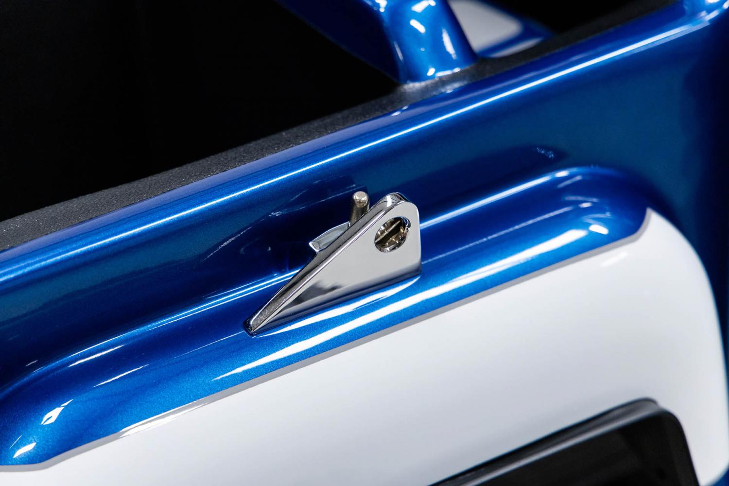 This 44-year old coin-operated children's ride is the ultimate collector's piece of memorabilia from the 1980's. A time when rock and roll band members had crazy long hair and the front of pickup trucks were square. The original fiberglass F-100 Step Side Pickup body was stripped and prepped to be straighter then the original factory model was. The body incorporates a hood scoop, front and rear bumpers. The original coin-box unit was removed and a chrome coin mechanism was discretely fitted into the body. This custom feature allows the ride to be more realistic appearing. It was painted with automotive grade-paint in the beautiful colors of blue and white with silver trim. A custom made front grill with headlights graphic was applied to the front and a custom made Ford graphic was applied on the tailgate of which both were clear-coated over. The windows, white body-side stripe pin striping and bumpers were painted in silver to for a realistic appearance. The paint work is high show quality throughout and was recently detailed to a brilliant shine. The rubber fender trim and operational rear taillights were also added for a realistic appearance. The pickup was outfitted with custom black wheels that are wrapped with Power Wheels Ultimate Terrain Traction tires. The interior is also made of fiberglass which was stripped and prepped to be straight. The cabin was finished in a durable black paint. The front seat was painted blue with white stripes to match the exterior. The steering wheel was painted silver and is next to the operational red horn button.
