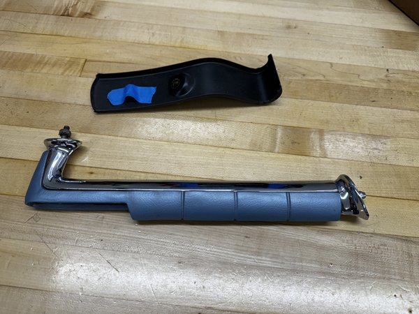 1962 Impala SS grab bar, reinforcing bracket, and hardware. Chrome is nice, painted blue.