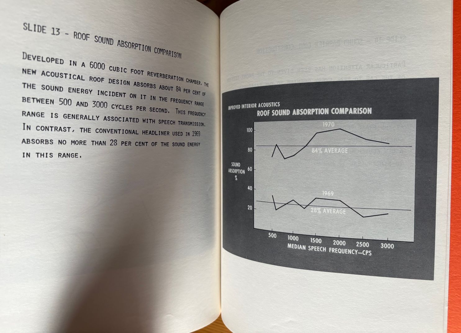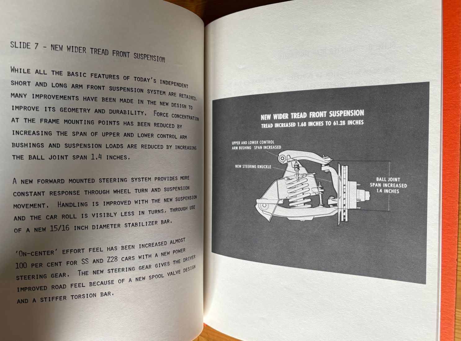 Content: - Slide 1: General Arrangement - Slide 2: Exterior Size - Slide 3: Interior Roominess - Slide 4: Power Teams (incl LS6) - Slide 5: New Front Frame - Slide 6: Standard Front Disc Brakes - Slide 7: New Wide Tread Front Suspension - Slide 8: Modified Rear Suspension - Slide 9: New Rear Stabilizer - Slide 10: Body Construction Detail - Slide 11: New Interior Acoustics - Slide 12: New Acoustical Roof Design - Slide 13: Roof Sound Absorption Comparison - Slide 14: Sound Barrier Cowl Construction - Slide 15: Trapped Edge Wind Seal - Slide 16: Rear Compartment Sealing $40 ///Ove