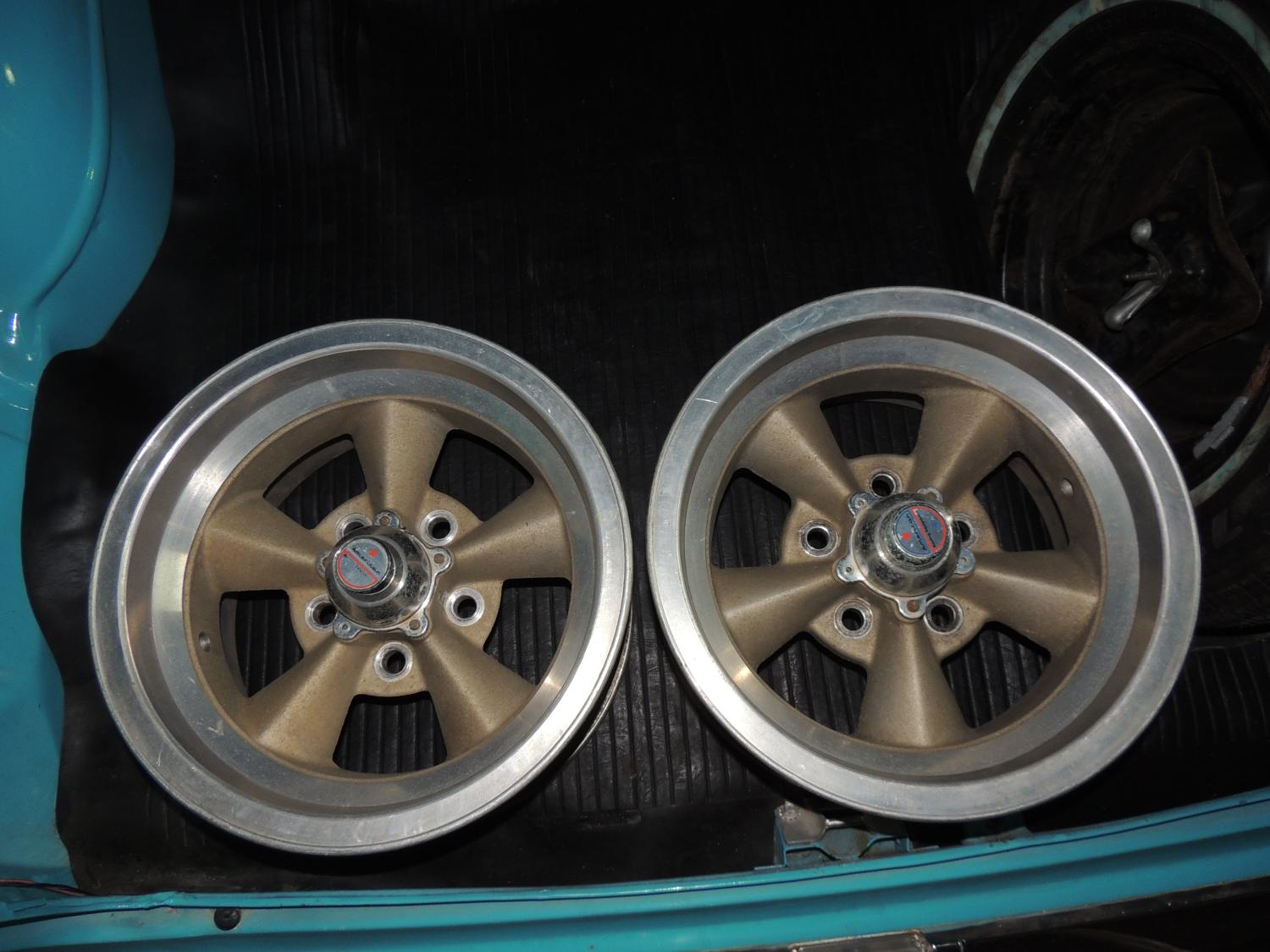 I picked up a pair of torque thrust wheels locally that a guy has had in his attic for the last 40 years. Identical size, width and offset as the ones on the car. Really nice condition. Did American Racing ever paint the centers gold? I am thinking not. Will likely clean all four wheels up and paint them all gray. I need to install the new master cyl and replace the rear wheel cylinders, so will wait until I have all the parts to do the wheels. I included a photo of one of the wheels that came on the car to show the color. I am thinking that is the color I want for the centers.