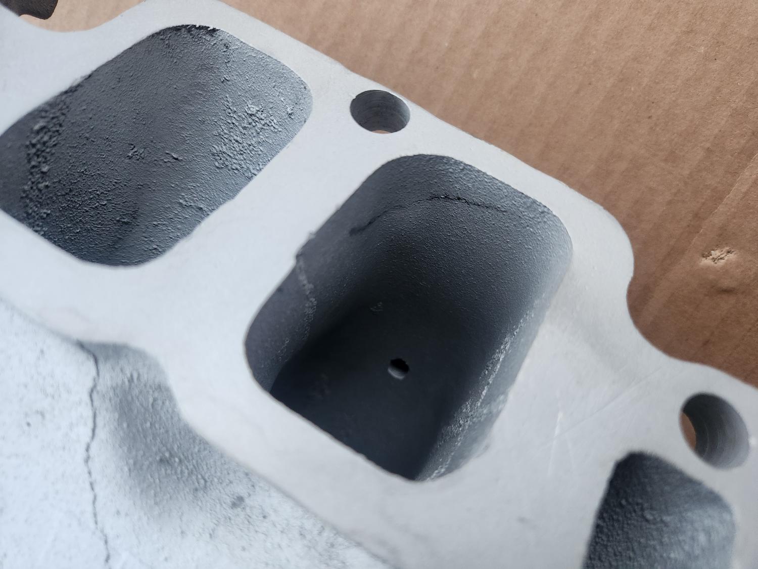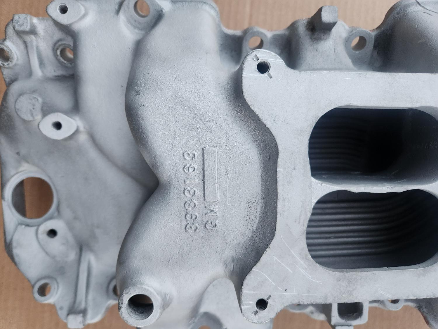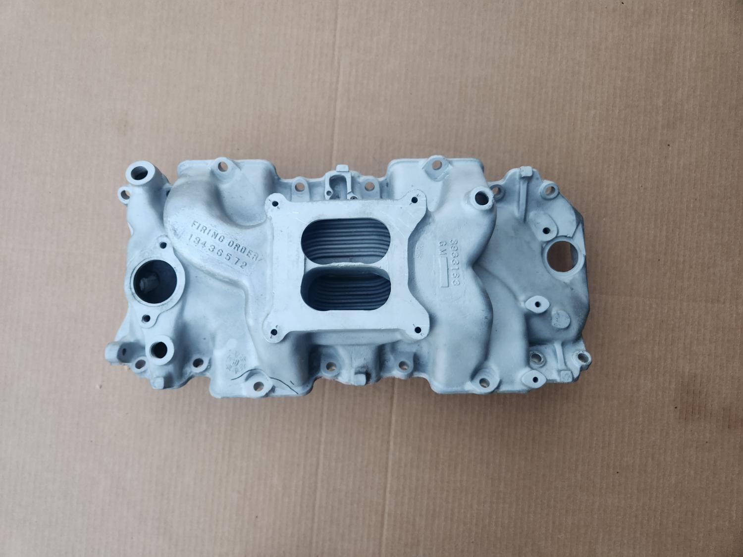 1968 #3933163 aluminum winters square port intake dated i-24-68 cleaned and has one small hairline crack around one outside bolt hole. Did not leak while on the engine. Can ship