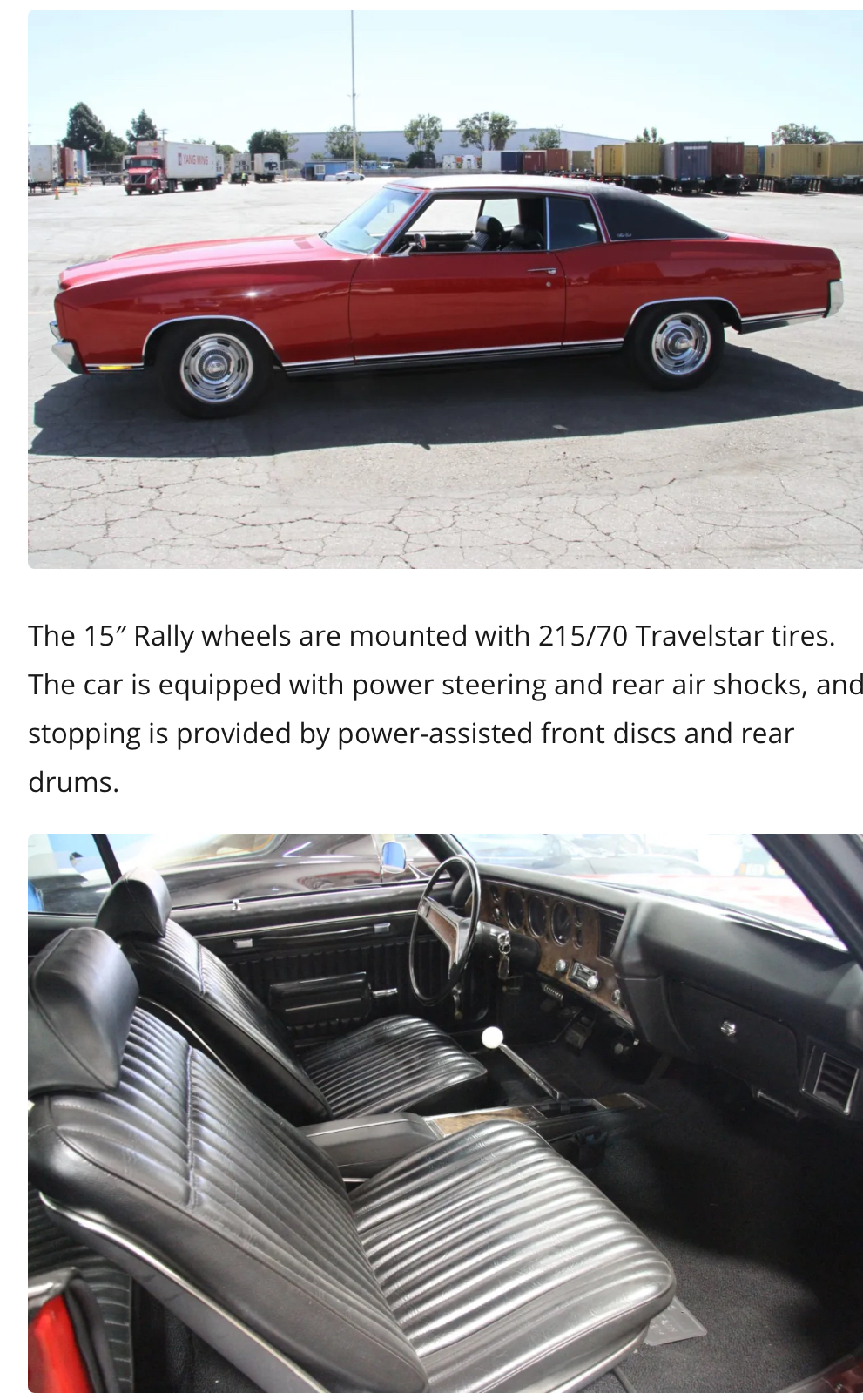 The ad has a comment section discussing the 330hp rating, claiming it was like an L-34 motor, NO! The LS-3 was the 402 version of the L-35 396. Low lift cam and nodular iron crankshaft. I'm sure the carb. and distributor timing were likely different as well. Worked on a lot of Montes at the Chevron station in high school...those fan shrouds were the size of 30 gallon oil barrels