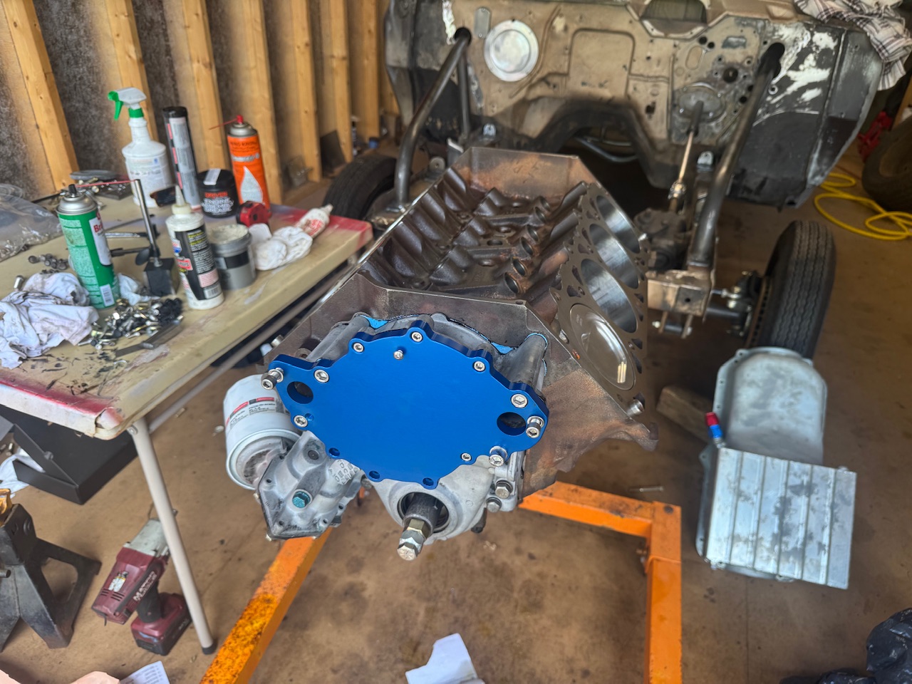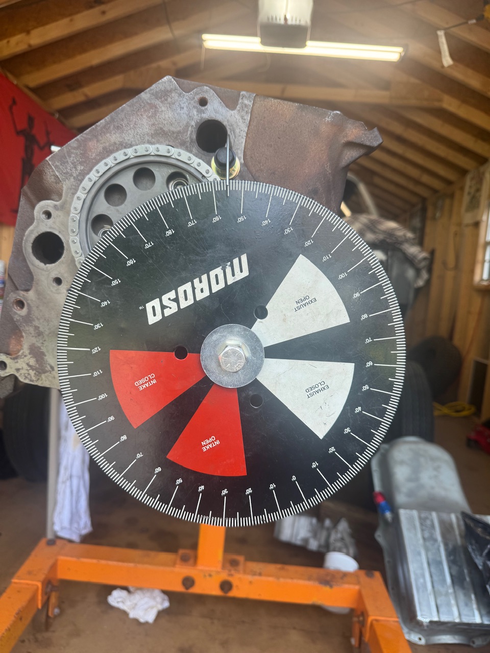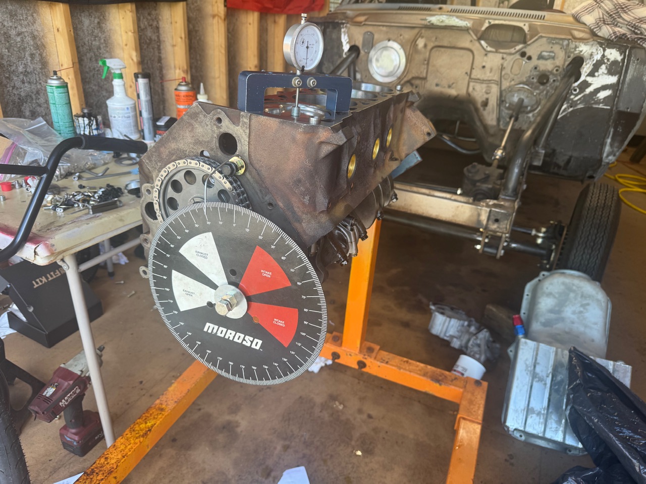 Stopped at an auto supply place and talked to the guy about primer and paint and decided to use them for all of my supplies for the car. I picked up epoxy primer and am ready to get started on the bodywork. This Saturday the car gets media blasted and then the real work begins. Spent some time when I got home working on the engine. Checked intake centerline and degreed the cam in. Ended up retarding the cam 2 degrees to put it at 108ish. The cam card calls for 110 on the centerline and I’m figuring on 1-2 degrees being added by the valvetrain and timing chain stretch. I then installed the front timing gear cover and began getting everything ready for the oil pan. The plate on the cover is for the electric water pump I’ll eventually have to order. Enjoy the pictures both of the work and Marty helping me on the engine and the car. Thanks for reading. I hope everyone reading this has a great day.