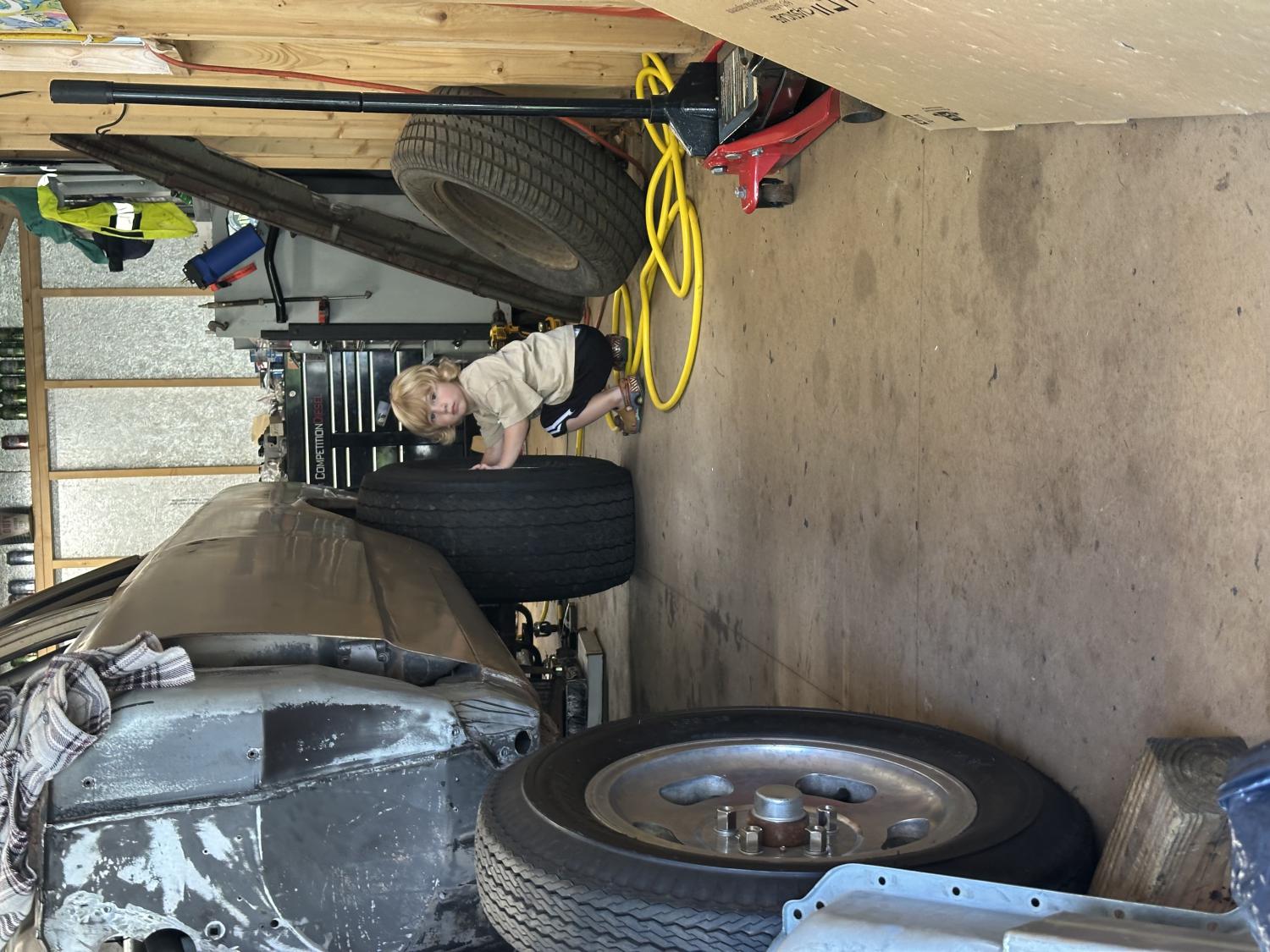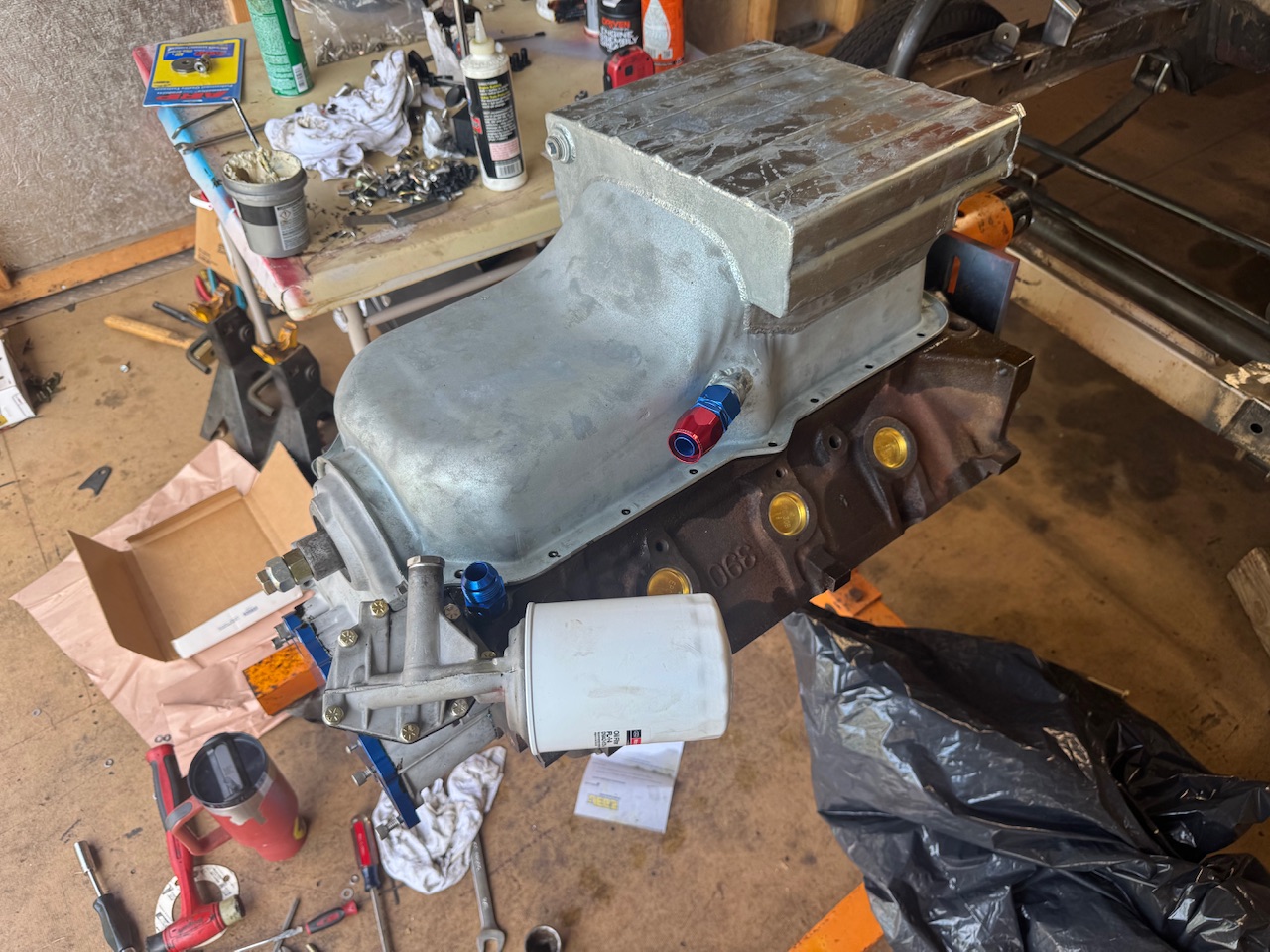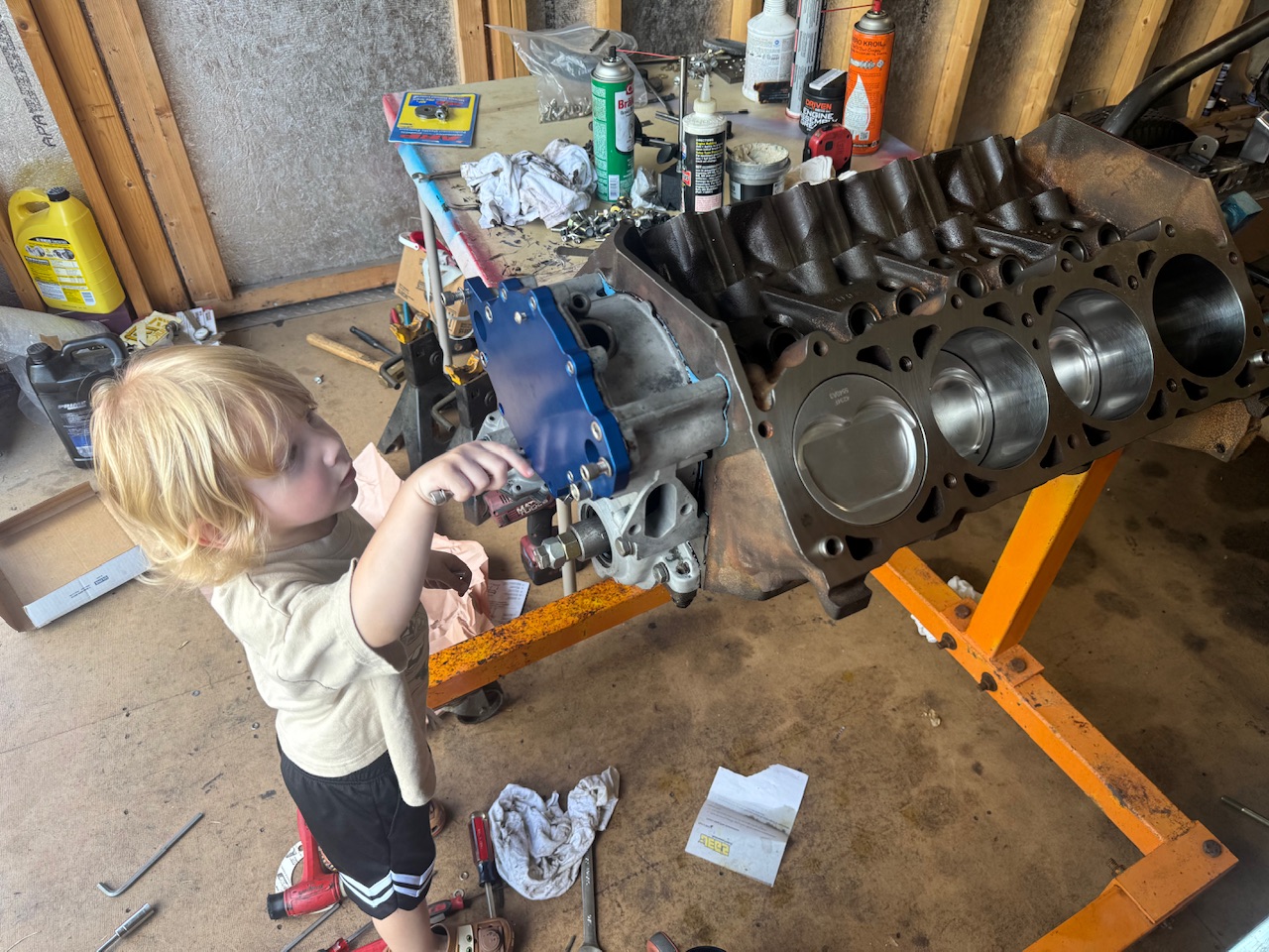 Stopped at an auto supply place and talked to the guy about primer and paint and decided to use them for all of my supplies for the car. I picked up epoxy primer and am ready to get started on the bodywork. This Saturday the car gets media blasted and then the real work begins. Spent some time when I got home working on the engine. Checked intake centerline and degreed the cam in. Ended up retarding the cam 2 degrees to put it at 108ish. The cam card calls for 110 on the centerline and I’m figuring on 1-2 degrees being added by the valvetrain and timing chain stretch. I then installed the front timing gear cover and began getting everything ready for the oil pan. The plate on the cover is for the electric water pump I’ll eventually have to order. Enjoy the pictures both of the work and Marty helping me on the engine and the car. Thanks for reading. I hope everyone reading this has a great day.