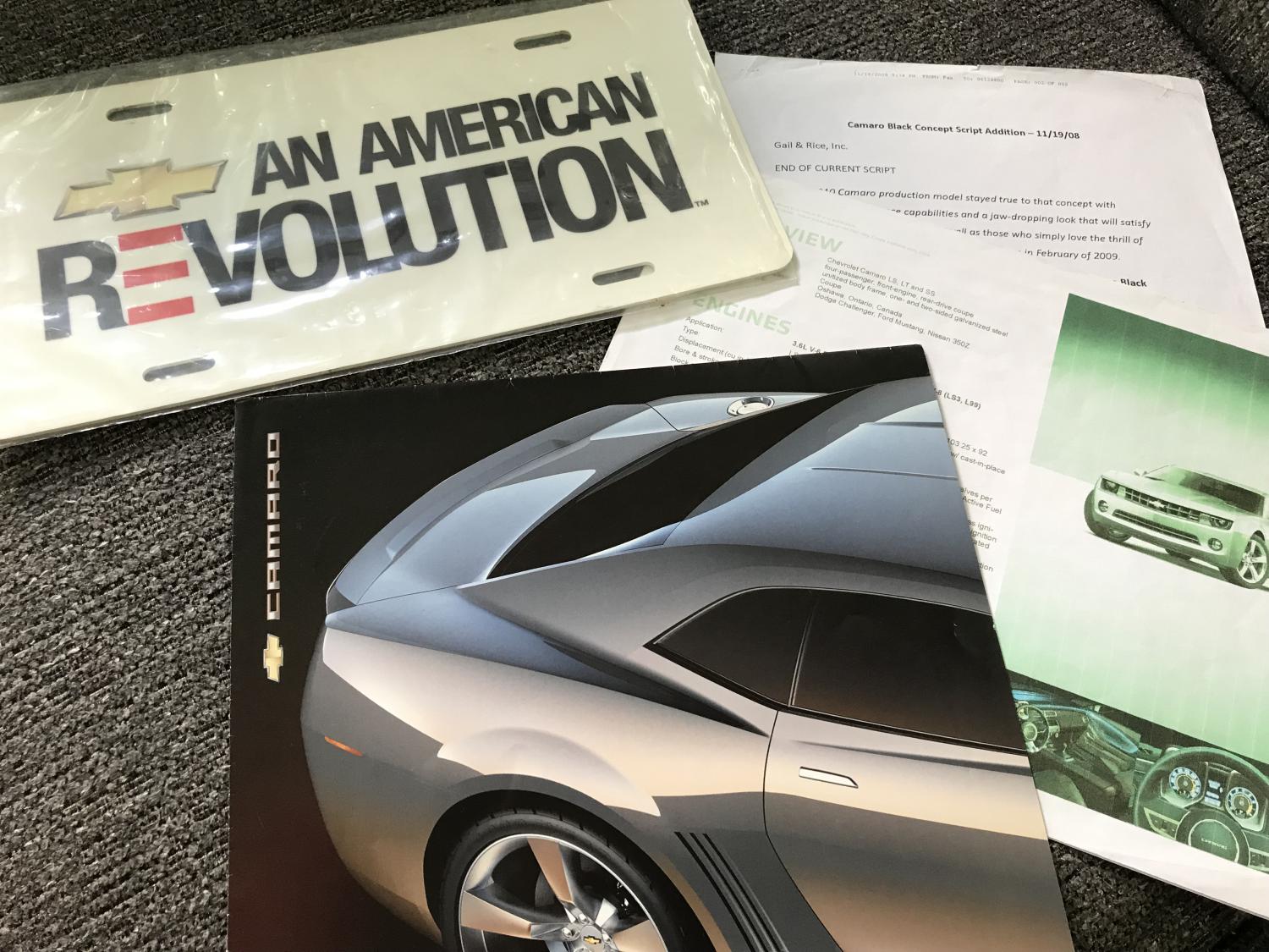 Here’s a brand new Lic plate, from GM that would have been on your new Camaro, not the tin ones you see on eBay, (Revolution campaign)fold out poster from press, pre production stats from GM for questions regarding the “New Camaro” 3 pgs, , and Gail & Rice script that the product specialist would say up on the tutntable after unveil, you’ll never find this much on the new Camaro again like this,