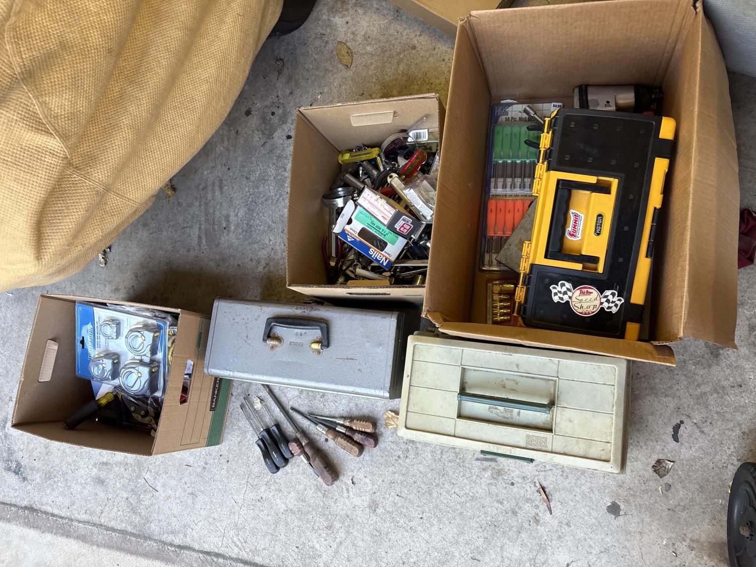 Here's some of what it started as: just boxes of wrenches and sockets and hand tools. I spread them all out over the garage floor and just started matching things up. I was able to move some of his nicer versions of my old stuff into my tool boxes (and next to his newer Craftsman box that is now parked next to mine.)
