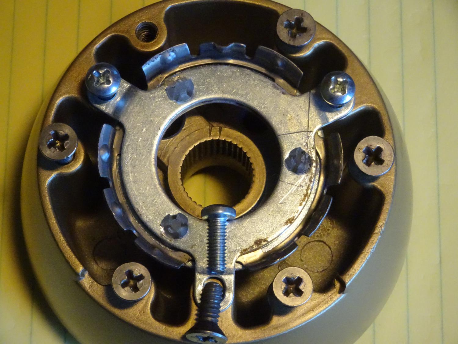 The plate screws are a smaller size than the wheel hub screws too. I suspect someone has put larger diameter screws on the plate. The screw heads are slightly smaller diameter than the plate.
