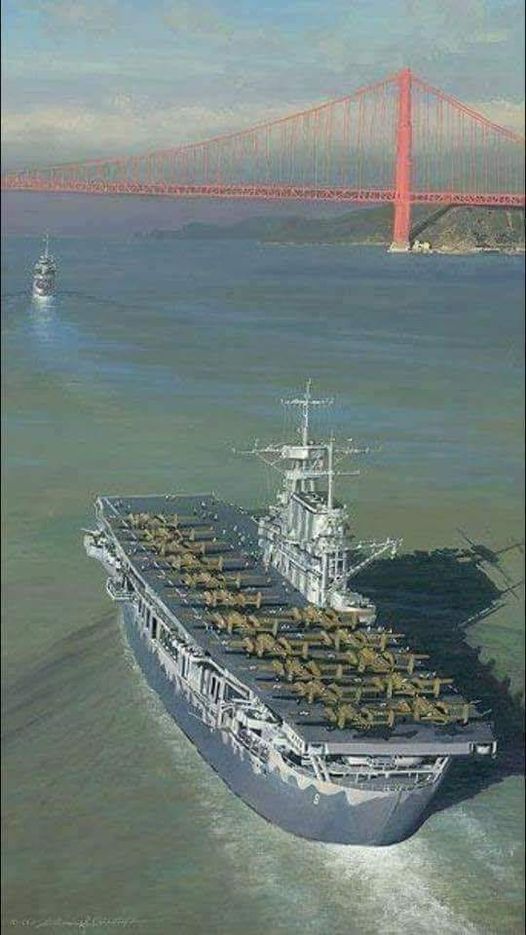 The USS Hornet CV 8 leaving San Francisco Bay 2 April 1942 after loading 16 of Jimmy Doolittles B25's at Alameda Naval Air Station