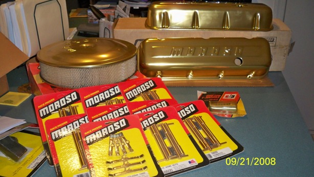 The gold stuff came out mid 1974. It's hayday was 75-77 and then Moroso came out with chrome then which took over. Good time period to be into cars...and the gold stuff really brings back memories. They were very popular back then everybody wanted to emulate the race cars and Moroso had the very first covers which were race weight. The valve cover boxes are older packaging 80's or 90's but the vc bolts etc is 2000 on up packaging but none of this stuff is made by Moroso any longer. The gold stuff is really coming back into popularity. As I said the 74-78 period was a great time to be into cars..they were cheap to buy and plentiful. |