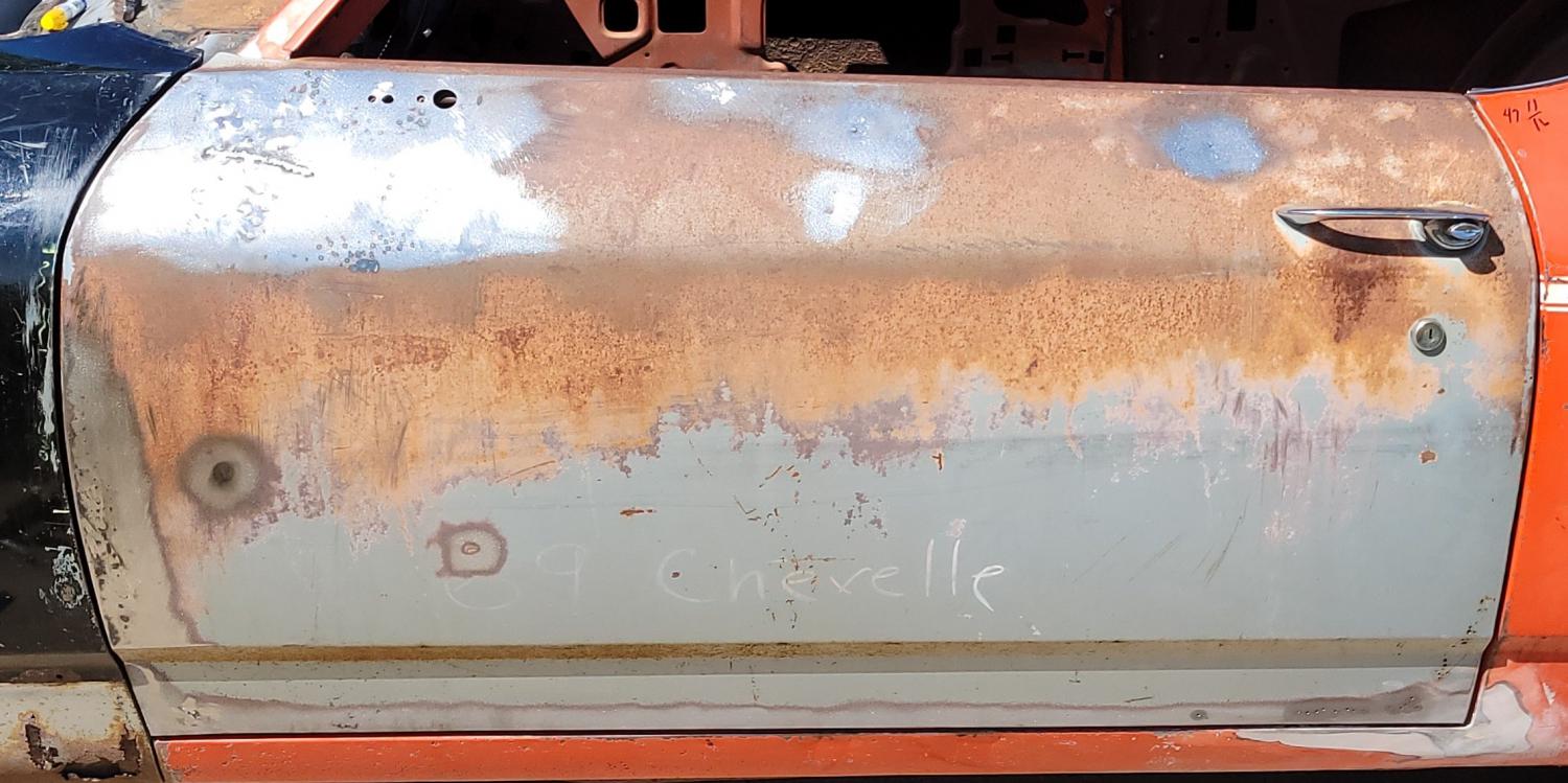 The rocker in the first picture shows the continue process of blocking, finding low spots and filling. Dad taught me to use minimal filler. We both somewhat cringe when we see car shows and they mud the full panel and block it. The door is back the basic, stripe, hammer dolly and in the case of this door acid off any light rust. Much easier to acid the smaller door than the roof. On this car I finally bought a dent puller. Really helps keep the filler down to as minimal as possible and with some panels you just cant get to the back side. The triangle in the bottom right of the door is just me cutting out some rust and repairing. I believe this is pretty common for 68/69 doors because of how tight the door frame is to the skin. |