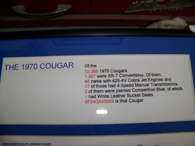 The car is 1 of 17 428 Cobra Jet 4 Speeds convertibles made, and 1 of only 4 with the Ram Air option and a 4 speed. The really cool part is this is the 1st Built (ordered in July of 69') and a Factory Test car sold new back to Ford R&E. When the car was found it had factory air conditioning which isn't listed on the Marti report but the guy who owned and restored the car swears that when he got the car it was original and never restored and had the cut outs where the air would have went along with the condenser still in place and the Air controls and venting in the dash which he said you could tell had never been touched. The car also is listed with 3.50 gears on the Marti report and when the car was found it had 3.00 and the only way you could get factory air was to have 3.00 rear gears in 1970. Being a factory Test car and being such an early car the story all makes sense to me and the owner/restorer is a knowledgeable well respected Cougar guy but Id love just to have some concrete evidence. Being 1 of 4 is already rare enough for me and it could possibly be the only surviving example but it would be 1 of 1 if I could prove the air conditioning.