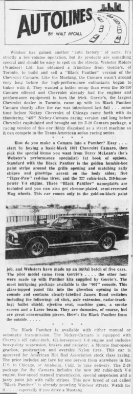 I have seen a very interesting article about the Black Panther cars in Newpapers.com. It is from the Windsor Star on Tuesday May 16th, 1967 and the piece is titled Autoline. Unfortunately, I am unable to open the article again.