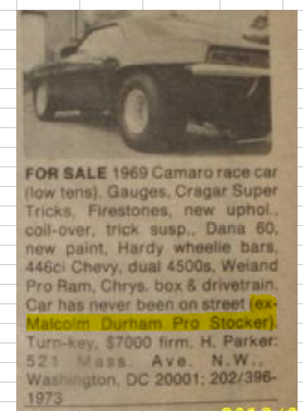 I'm convinced Macolm Durham had two '69 Camaros. Looks like the ZL1 changed classes while in his possession.