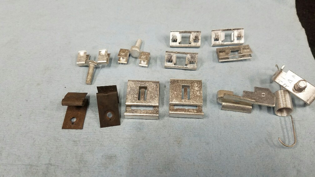 Bottom row left to right 2 original center o'clock mounting brackets for 69 Camaros. 2 original brake clutch pedal large clevis retainers. Very nice restored pieces with <u> stamping. Next is emergency brake cable retainer with C stamp. Then emergency brake pedal return spring and emergency brake light switch with original stamping. Top row is idiot light retainers and center mounting studs. All pieces $5 each plus $3.50 to ship. Free shipping on orders over $20. Ppff |