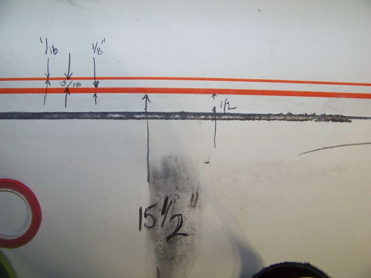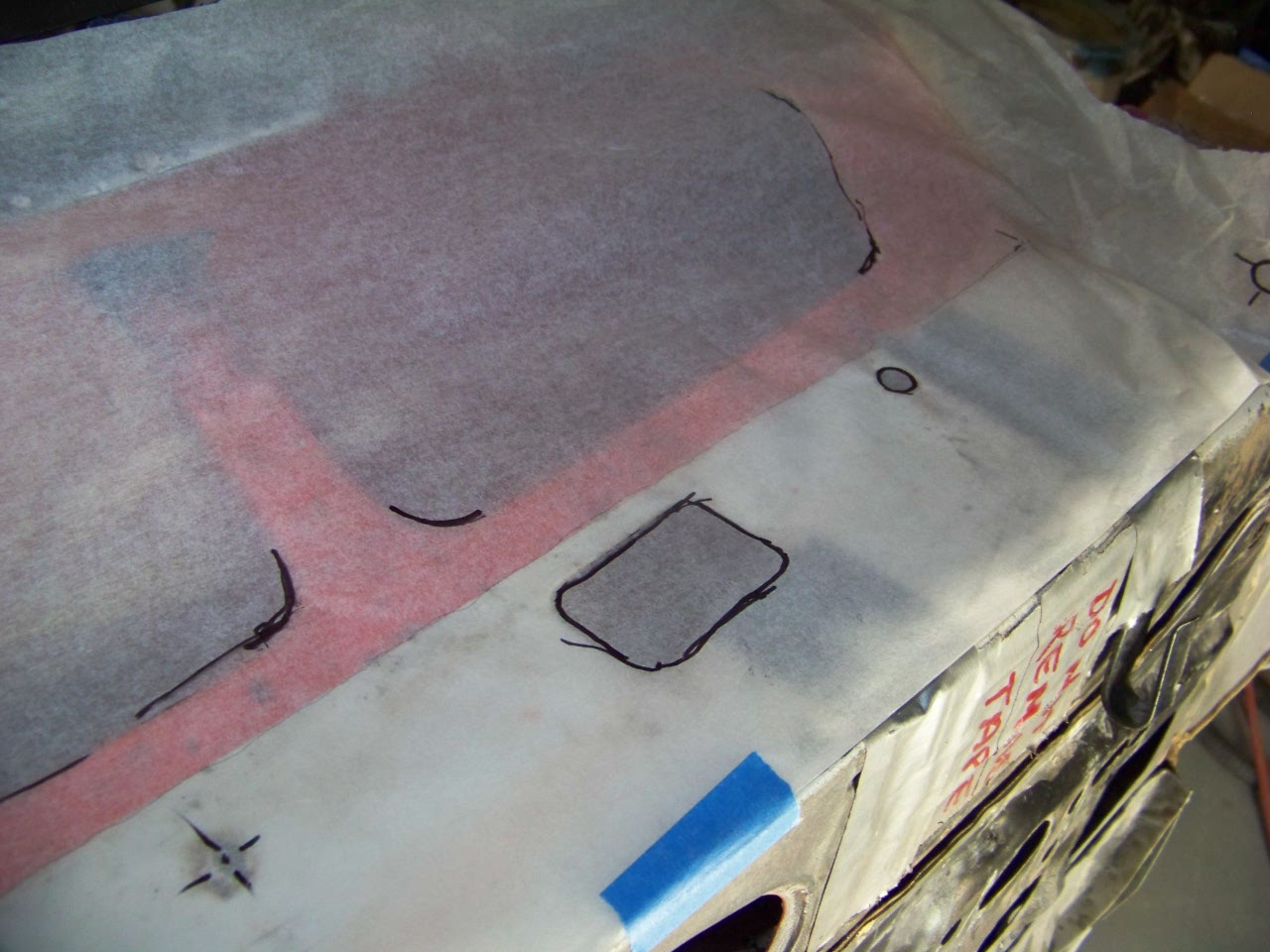 Firewall, Fisher notes under the paint. Cleaned the tracks and gear boxes in the window regulators black chunky grease comes out - I use Mobile1 Black Pearl open face hi-tack gear lube in the gear boxes - Laid out tracing paper to get the outline of the "mask" correct. You can see where the hand pulling the mask got into the wet paint when picking it up. One door had original paint so I carefully noted all of the dimensions of the stripe - it's 22-3/4" from the front edge of the door to the and tip of the stripe.