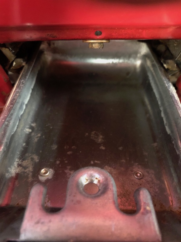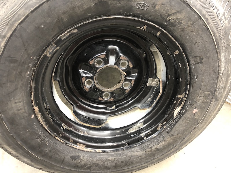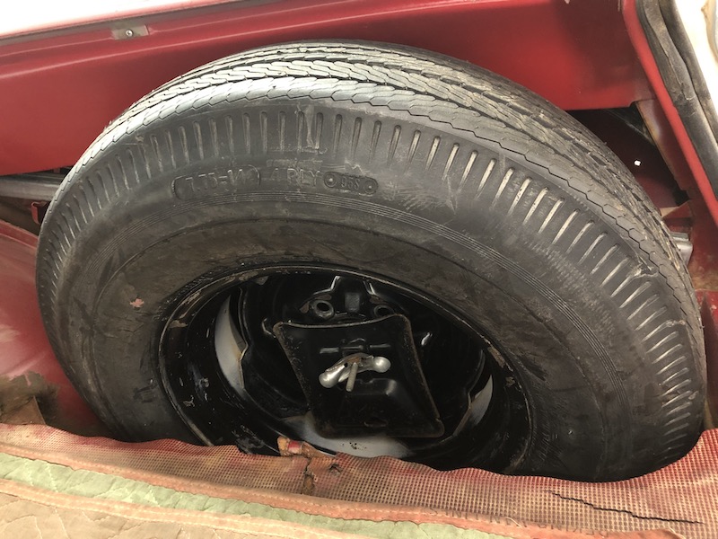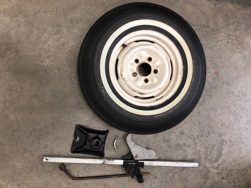 Mostly uneventful back here. The spare tire well cleaned up well (when's the last time you've seen a well with no rust??). The cargo mat, while intact, is an eyesore, so I have a rubber mat that will cover that area. The jack being in a protected environment has survived very well, with just a light cleaning. The spare wheel also cleaned up nice, note the body color overspray through the slots. The tire of course is a repro. Now, it's time to raise the hood..... |