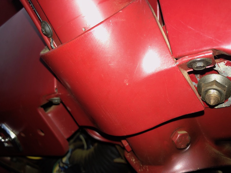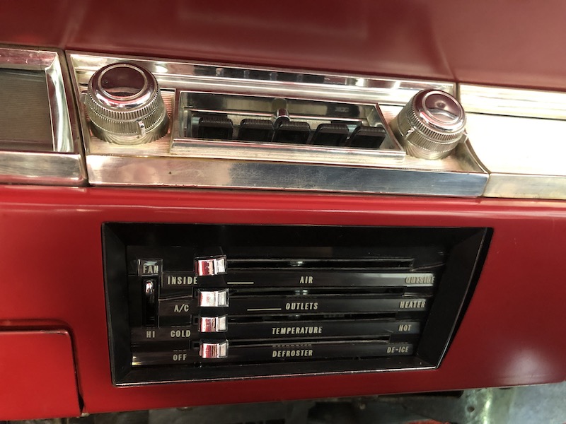 Out comes the steering column and drop the dash. Thick layers of dust under here! Blow it out, then cleaning with Simple Green and lots of towels, blow out the heat and a/c ducts etc. Replace the toasted dash pad with a proper colored dark red one from my stash. Clock is sent out for repair, install a dash speaker and the AM/FM works!! ![]() Lube heater control cables and replace broken levers. Aluminum Brightener bath for ash tray, other stuff that escapes my memory right now. Put it all back, everything works, whoo hoo!! Chrome polish on column levers chrome, and using red interior paint left over from my maroon SS convert, fix steering wheel cracks, paint and clear. An unusual feature, this car is a 10B Fremont and has the very early '67 production steering column under dash cover. Later cars don't have this cover or the dash panel provision to mount it. I have a 10C Leeds car that doesn't have it. |