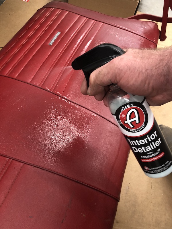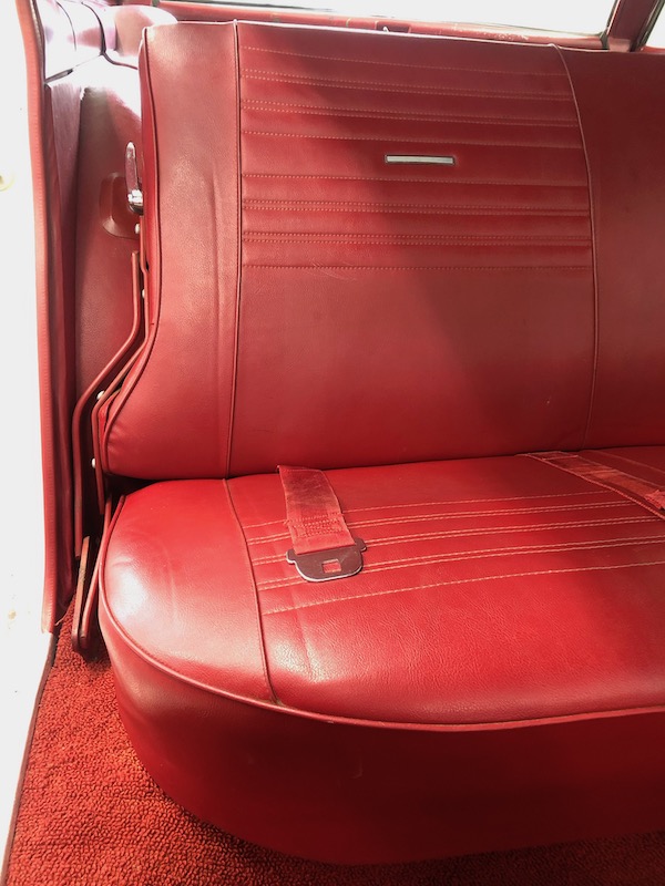 More interior. With the dash all done it's time for more cleaning. I did mention cleaning didn't I??? Clean, clean clean.... With Both seats out the carpet was pulled for a professional cleaning, it turned out fairly well in spite of some wear under the driver's feet. The front seat needed new covers, since Legendary doesn't offer covers for a wagon/4 door, (no split back) my upholstery guy ordered three yards of red vinyl and built covers incorporating the original heat pleated back side and matching the pattern of the original. Two arm rest pads were also covered with this vinyl. The rear cushions are in nice shape, I cleaned them (and the entire interior) with Adam's Products Interior Detailer (Thanks Dan and Dave!). Surprisingly, Jani offered to put the seat belts in a mesh laundry bag and run them through the washer, they came out pretty nice. Note that they are optional Deluxe belts. |
