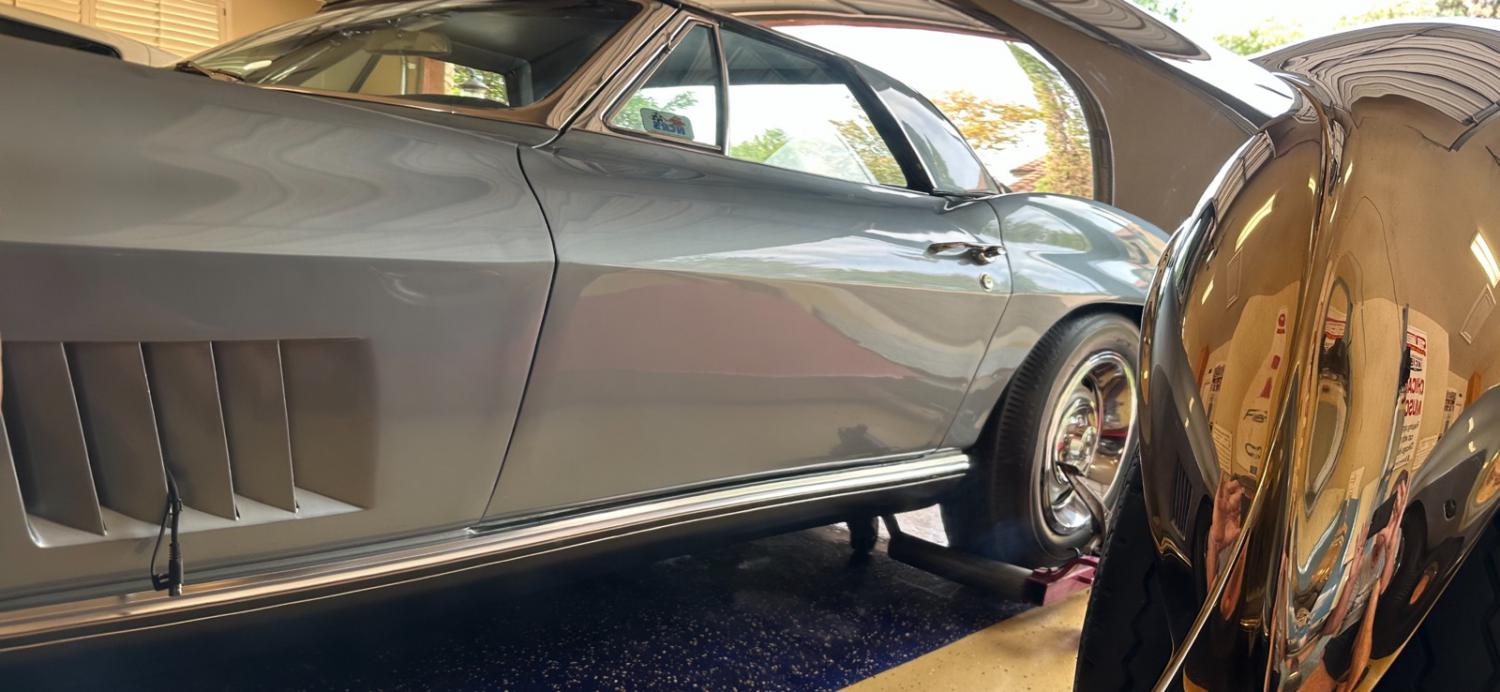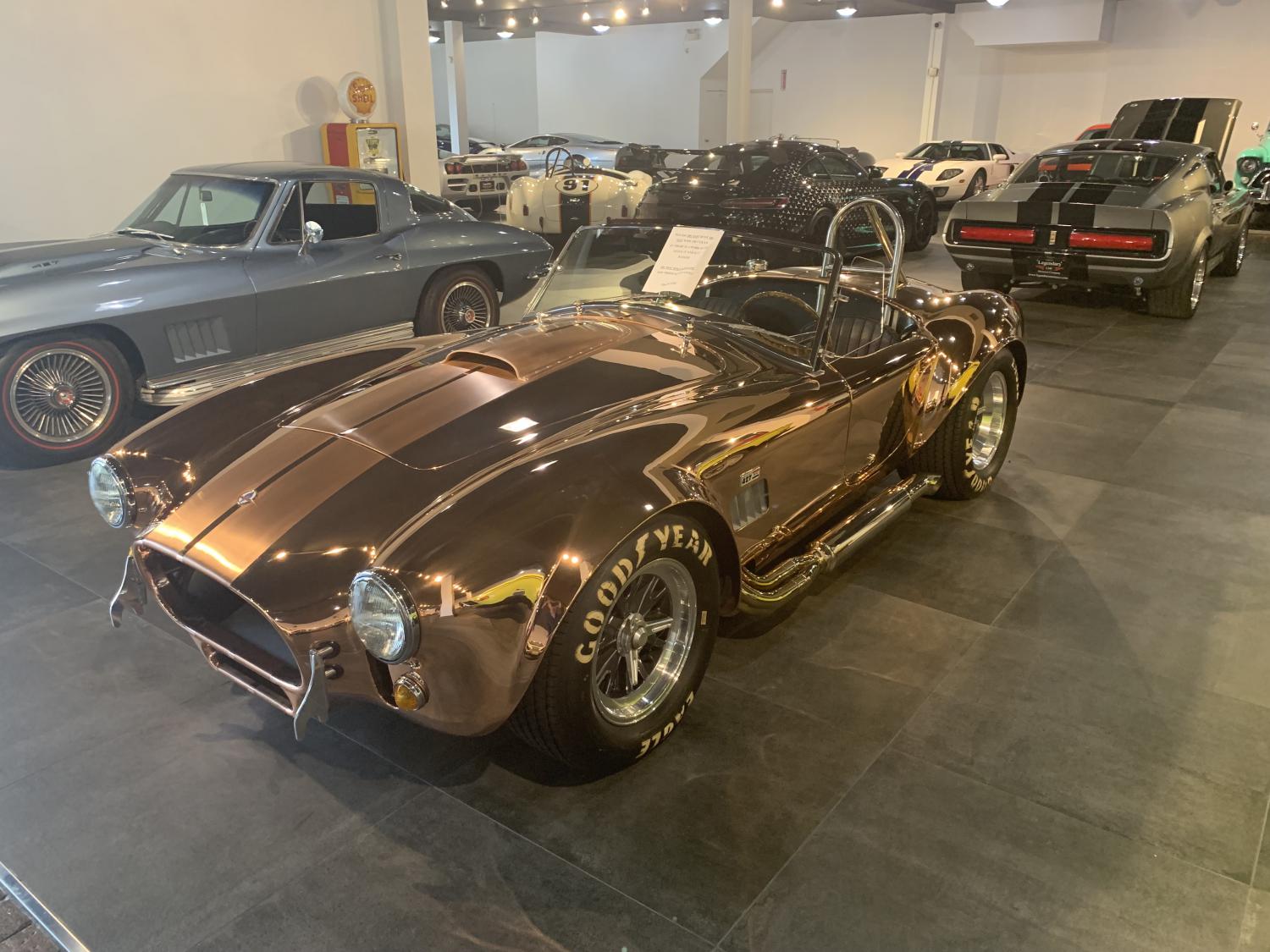 The Bronze Cobra hit 1,000 miles today. The car is a blast to drive, you have to get to third gear and still nurse the throttle before the tires hook up. I took a picture of my Elkhart Blue car in the reflection of the door, you can see this is a mirror image reflection on the polished bronze door. The car needs to be polished every two or three months or it tarnishes like a pot on your stove top. I still love it, but it's lots of work to maintain.