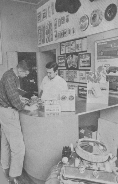 Looks like that 68 is an original big block car from the pictures. You can see the big block heater box. [/ QUOTE ] I read somewhere that Joel Rosen preferred that buyers order a L78 car and then do the Phase conversion from that starting point. They'd pull the L78 and sell it at the Baldwin parts counter. The picture shows the Baldwin Chev. parts counter circa-1968 and you can clearly see a L78 engine---probably yanked during a Motion conversion. (The original photo shows the "396" air cleaner sticker clearly.) |