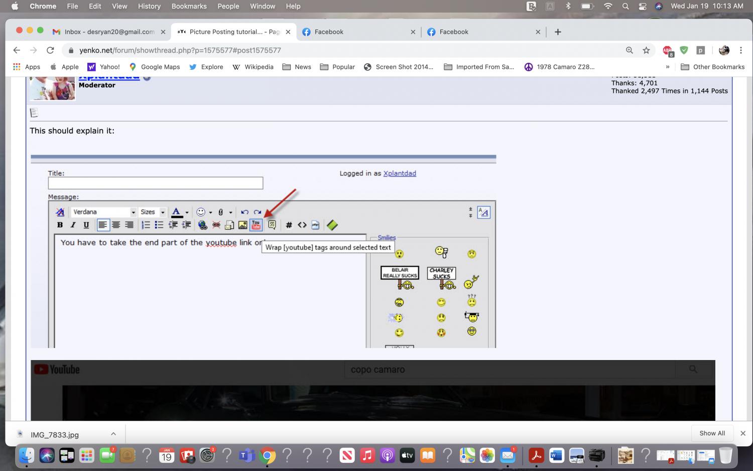 ![]() Here goes! First you'll need to go to this website Easy Thumbs software and download the FREE program. It's small and won't take up that much space on your hard drive. Once you install the software you can 'tab' to a screen that looks like this: Make sure that you change the default setting to 600, 600 or 800, 800 for bigger pictures, as in the circled areas. Also set your jpeg output quality to 80 or less...that normally keeps the file size manageable You will then need to 'tab' to the 'preview output' page and set up where you'd like to "store" the resized photos...as shown here. I normally save to the desktop for ease of finding them. You can do one picture at a time, or a bunch. The program is really fast! (make..or make all) You'll then need to sign up here: Photobucket The initial screen looks like this: ![]() The sign up page looks like this: ![]() Once you sign up, you'll come to this page: ![]() You can load one picture at a time, or as many as 19 pictures at once!(listed as submit multiple pictures) Once the pictures are uploaded, all you have to do is 'right click' as shown in the photo below and select 'copy'. Then make your post on Yenko.net and wherever you want the picture...skip a line and then hit paste! ![]() That's all there is to it...and that concludes the tutorial for now. PM me if you have any questions Bruce
