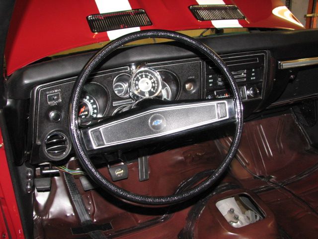 Notice that the steering column cover and ashtray are slightly duller than the main dash. This is normal and I see it all the time on the 70 Chevelles. None of these pieces were repainted, only cleaned thoroughly and reinstalled. The rear seat divider was not perfect but was reusable and since it was the original I elected to use it instead of the wannabe reproduction. I do not like the looks of those when looking thru the trunk so this works for me. Tonights project is to finish up the firewall forward wiring then onto the carpet and window regulator installation.