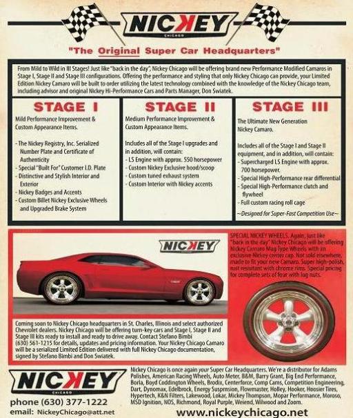 All of the details are not set in stone, at this time, as this is a work in progress. However; We do have most of the details for the Stage I, Stage II and Stage III Conversion Packages dialed in. We have established a Dealer Network, in order to fulfill Customer Orders, in one of two ways. We have dealers who feel confident that they will promptly receive Camaro inventory for Stock; Method One, will be from off their showroom Floors. These dealers will at some point, in the future have Nickey Camaros in stock and ready for delivery. The second Method is that you will be able to place a SOLD order, through one of these Dealers and then have your car built to your specs, off the Nickey Option Sheets. We will be anouncing all the participating Network Dealers and will also list the specs and pricing, as soon as we have them available. Please do not hesitate to ask any questions. I will do my best to answer them. Regards, |
