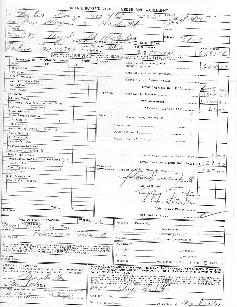 In approximately April 1972, Wayne Hackett of Waterloo, Ontario was looking to buy a car. Wayne liked the new Corvettes, but with young kids, he needed a car with a rear seat. Wayne had a friend who worked at Forbes Motors, the local Pontiac dealer in Waterloo, so Wayne went there to see about buying a new Trans Am. Wayne wanted a four speed car, but the salesperson told him they were hard to get and it would take between eight to ten weeks to get one. Wayne did not want to wait, so he left without buying a car.