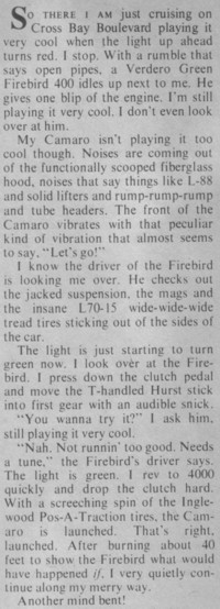 This is from the January '69 Rodder and Super/Stock magazine report on driving the B-M '68 Phase III Camaro. Joe Oldham, who also wrote for Cars Magazine, wrote the report.