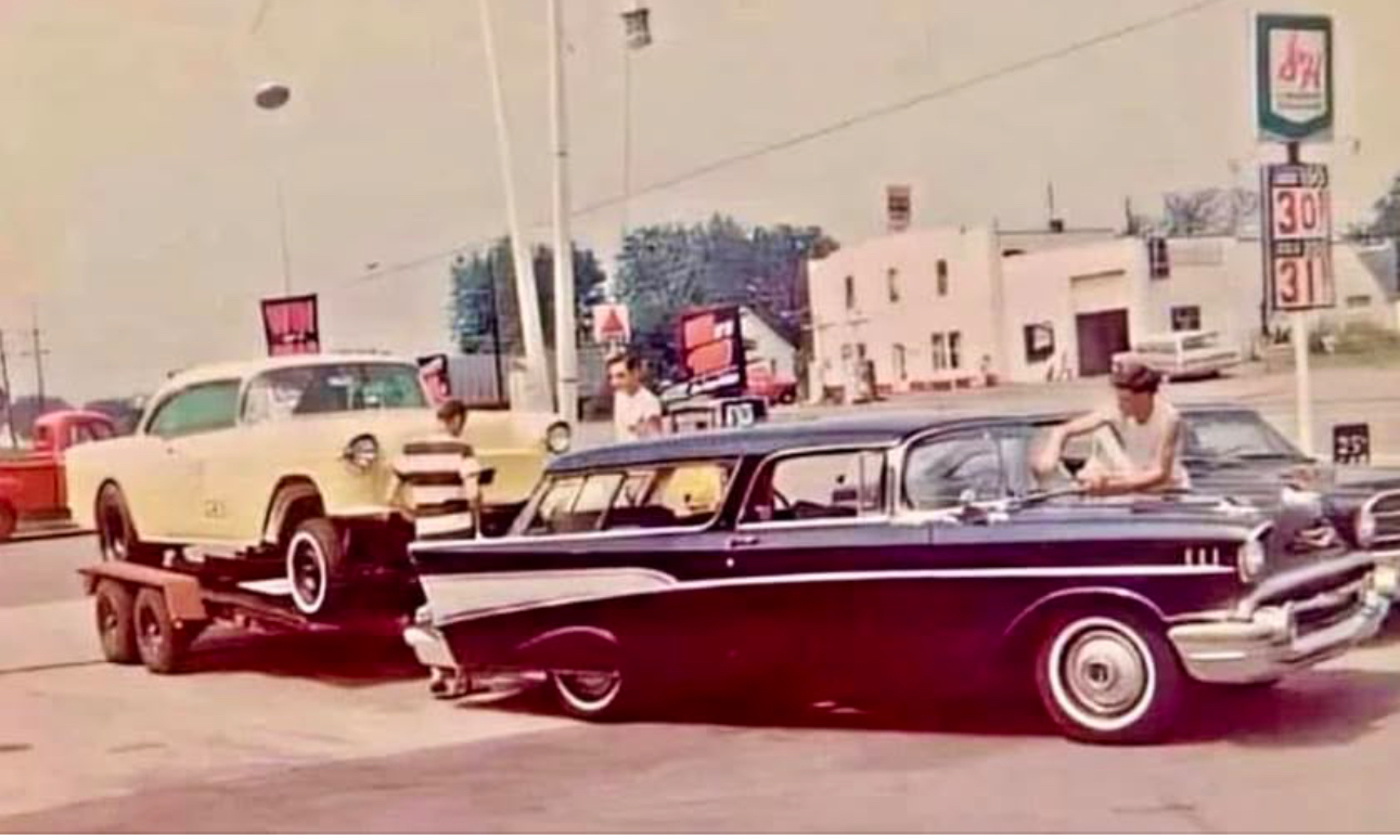 Skirted Nomad pulling a mean ‘55, Yenko Chevelle yanked by van